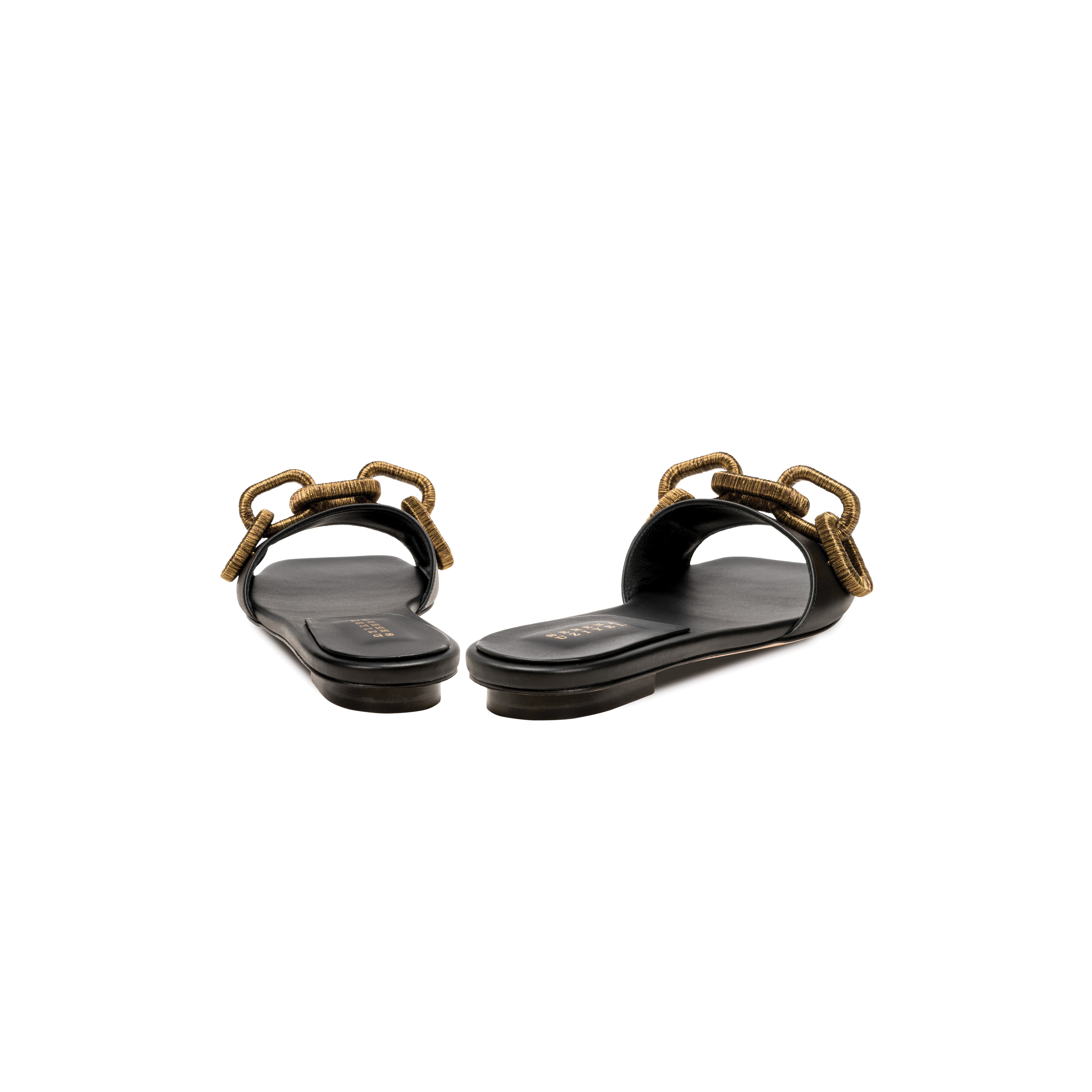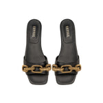 The Catena sandals are the true fusion of comfort and glamour; built with pure Italian black soft leather, the expertly crafted sandal sits on a delicate ten millimeters uplift together with an opulent antique gold metallic chain to illuminate every step you take.