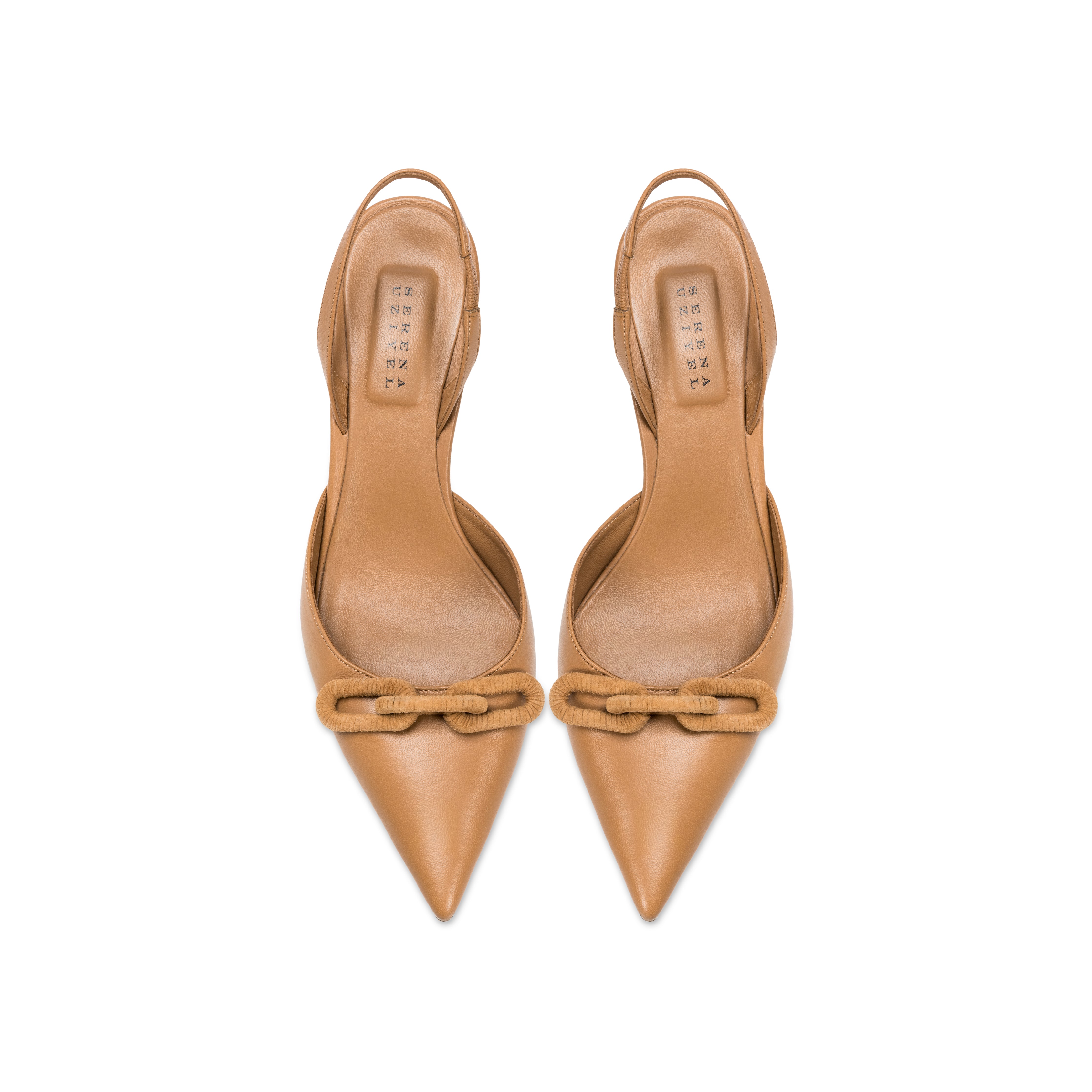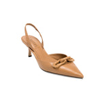 The Catena Mid-Heel Slingback Pump is a chic and timeless piece that will be your go-to when looking to add a touch of sophistication to any ensemble. A slender kitten heel with a closed toe, the shoe comes in a soft latte leather finish with a slingback strap that lightly embraces the ankle. The elegantly pointed toe is adorned with the signature Serena Uziyel chain link, composed from delicately hand-woven latte suede. Artful, refined and striking, the Catena Slingback Pumps are a piece to treasure for years to come.