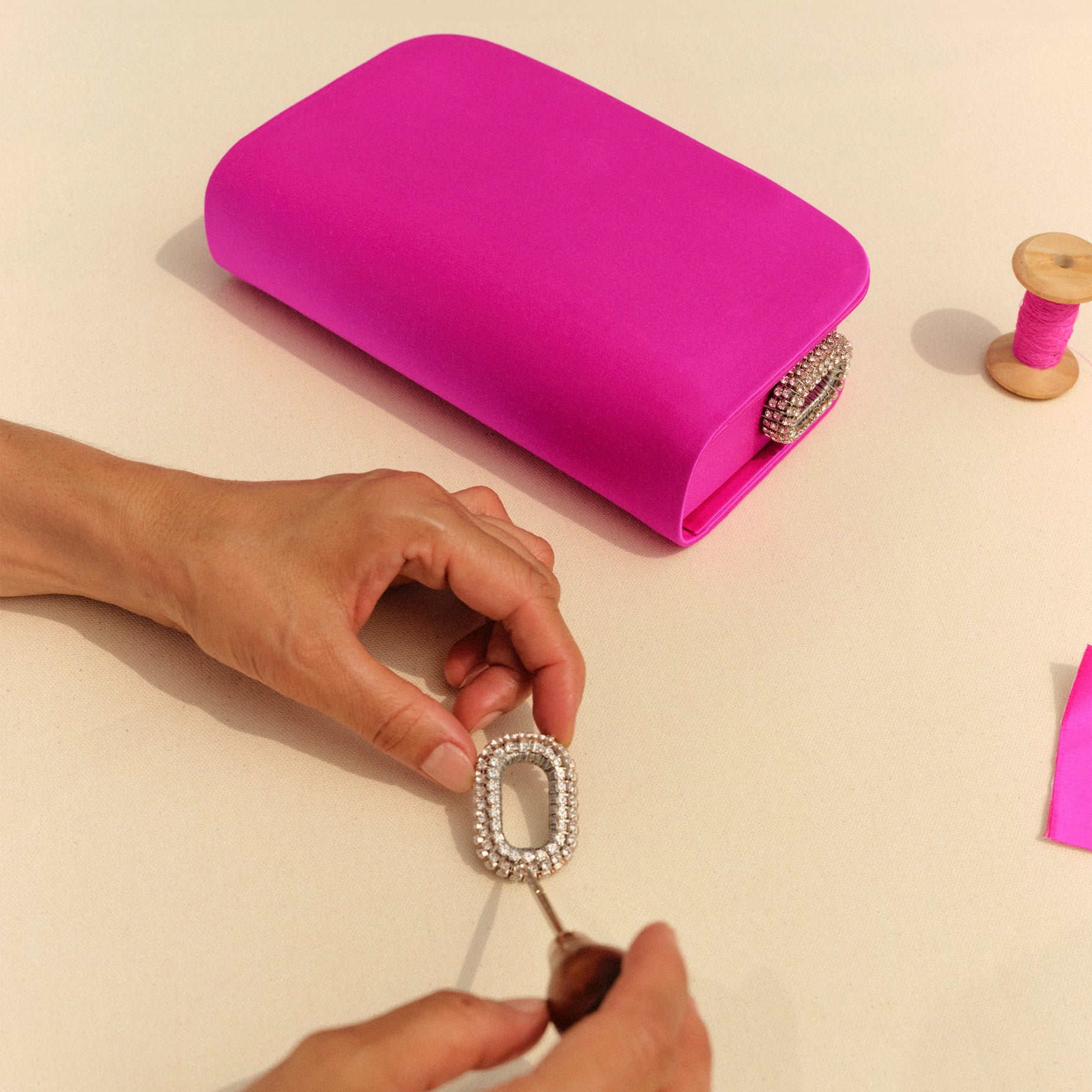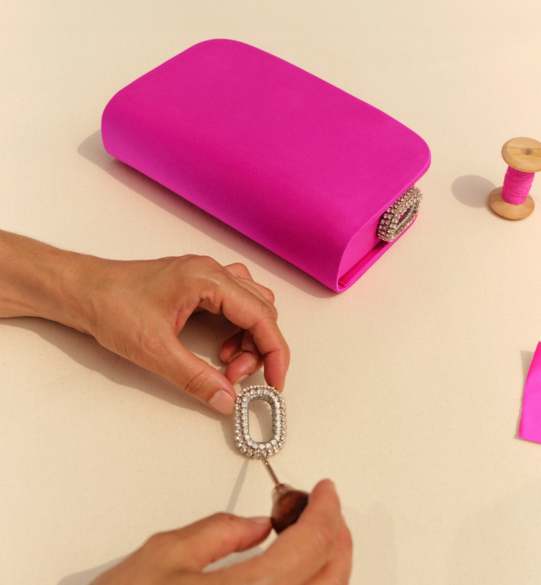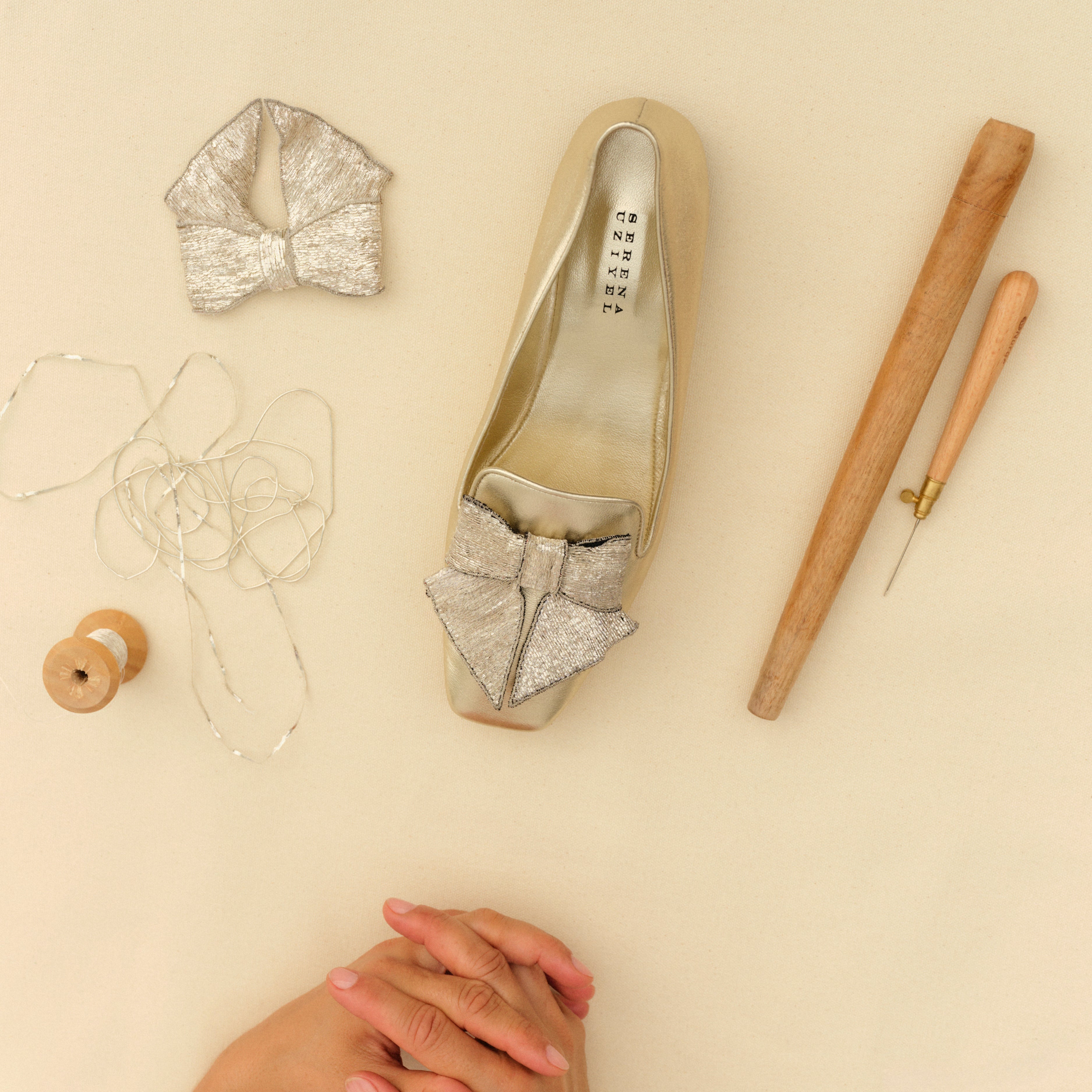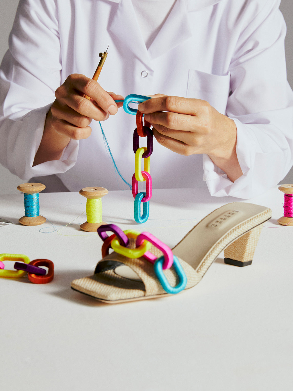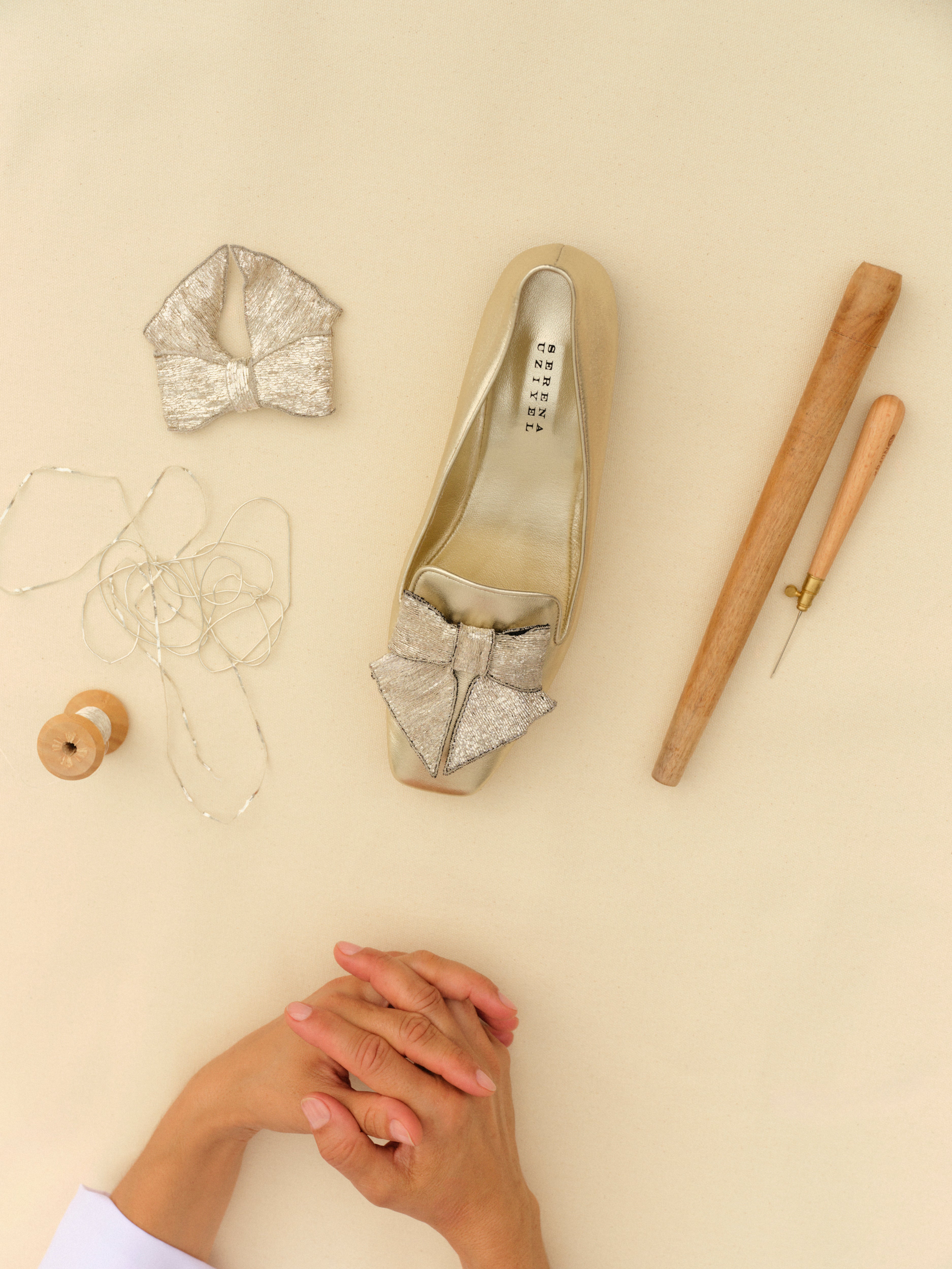Deeply detailed embroidered embellishments, such as silver and gold handcrafted chains resting atop a leather point-toe pump, are custom-made through an ancient wrapping technique, an intricate process that can take up to 35 hours to create a full chain-link. The final product is fine elegance, feminine sophistication, contemporary craftsmanship, and something truly extraordinary. The legacy of exceptional craftsmanship is embedded within the lineage of the Serena Uziyel brand. Here, an homage to heritage has always been a time-honored tradition.