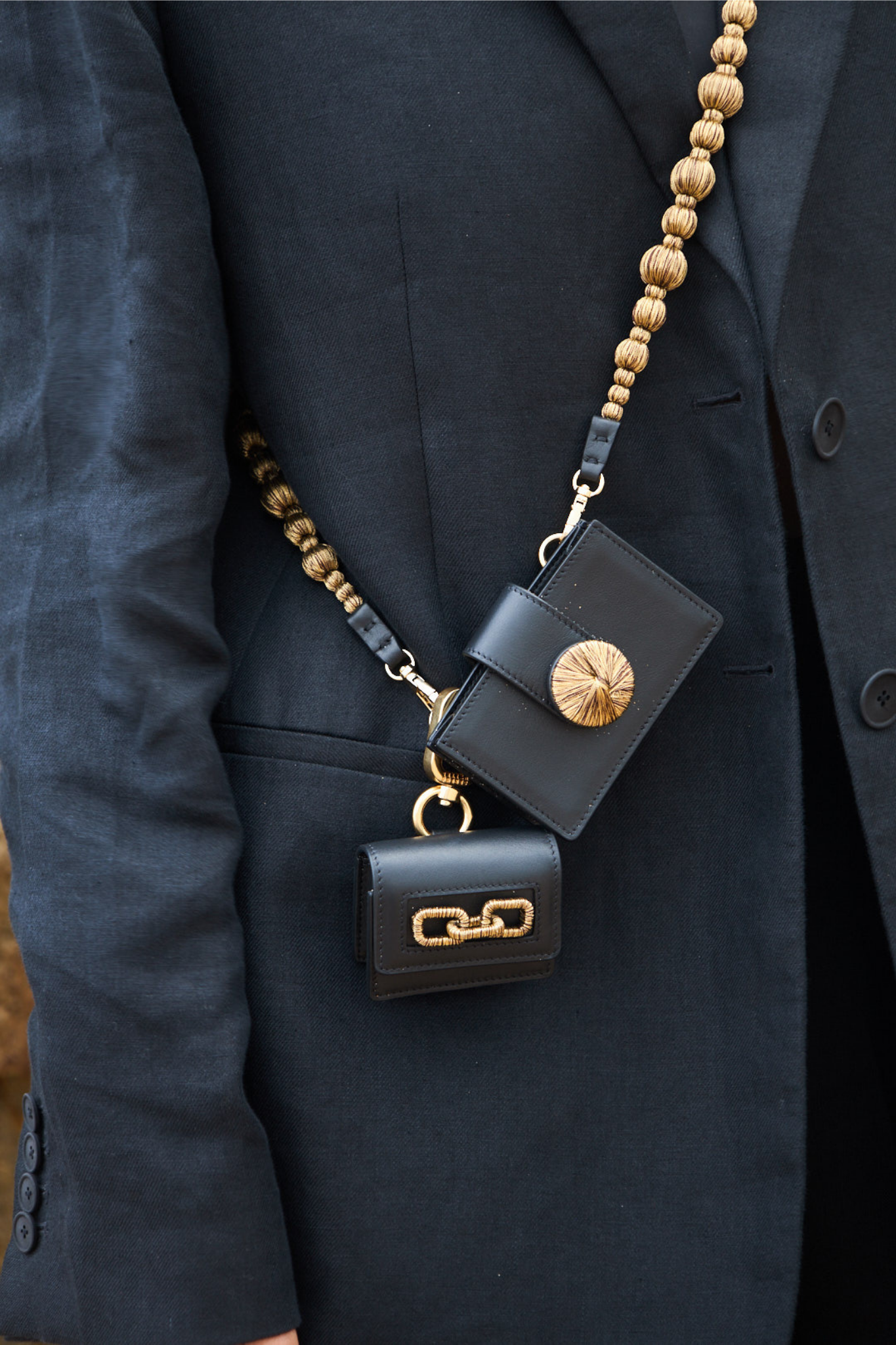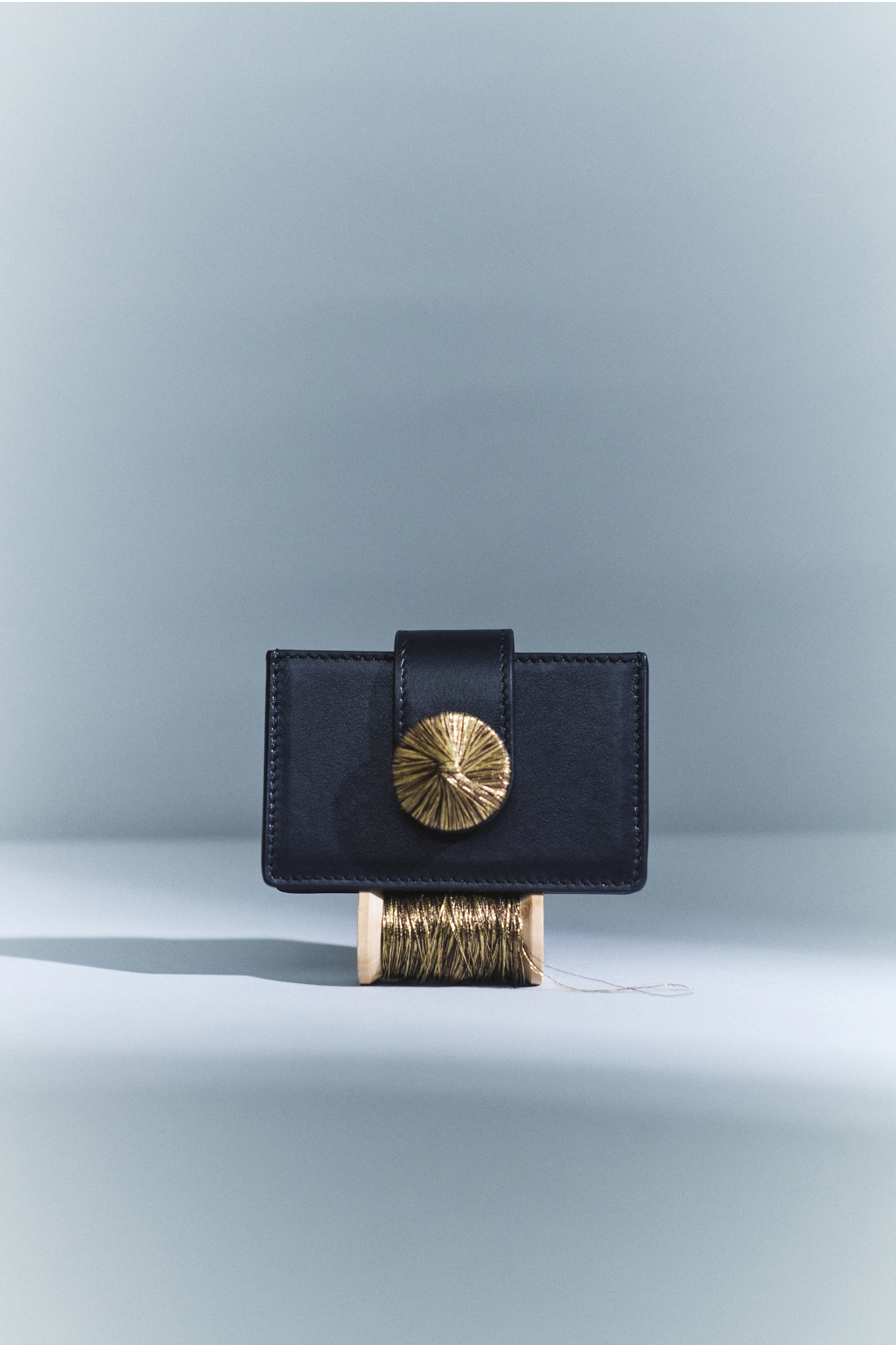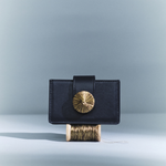 A refined accessory elevated with iconic Serena Uziyel details. Alessa card holder is crafted using traditional techniques and adorned with handcrafted elements in signature shimmering metallic threads. An embroidered disc secures the fastening, while the detachable strap is finished with delicate strings of embroidered balls—transforming a small piece into something sculptural and storied.