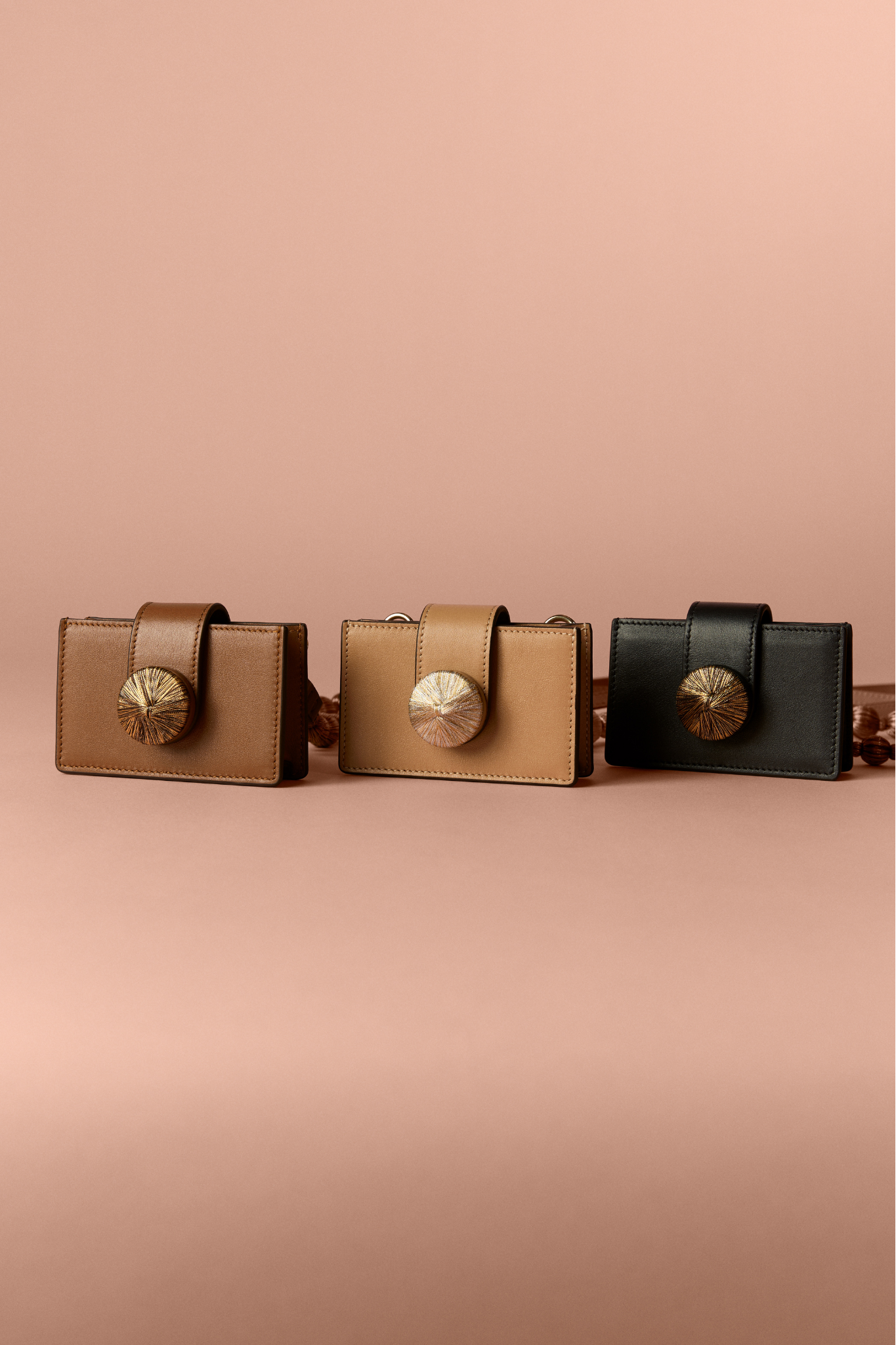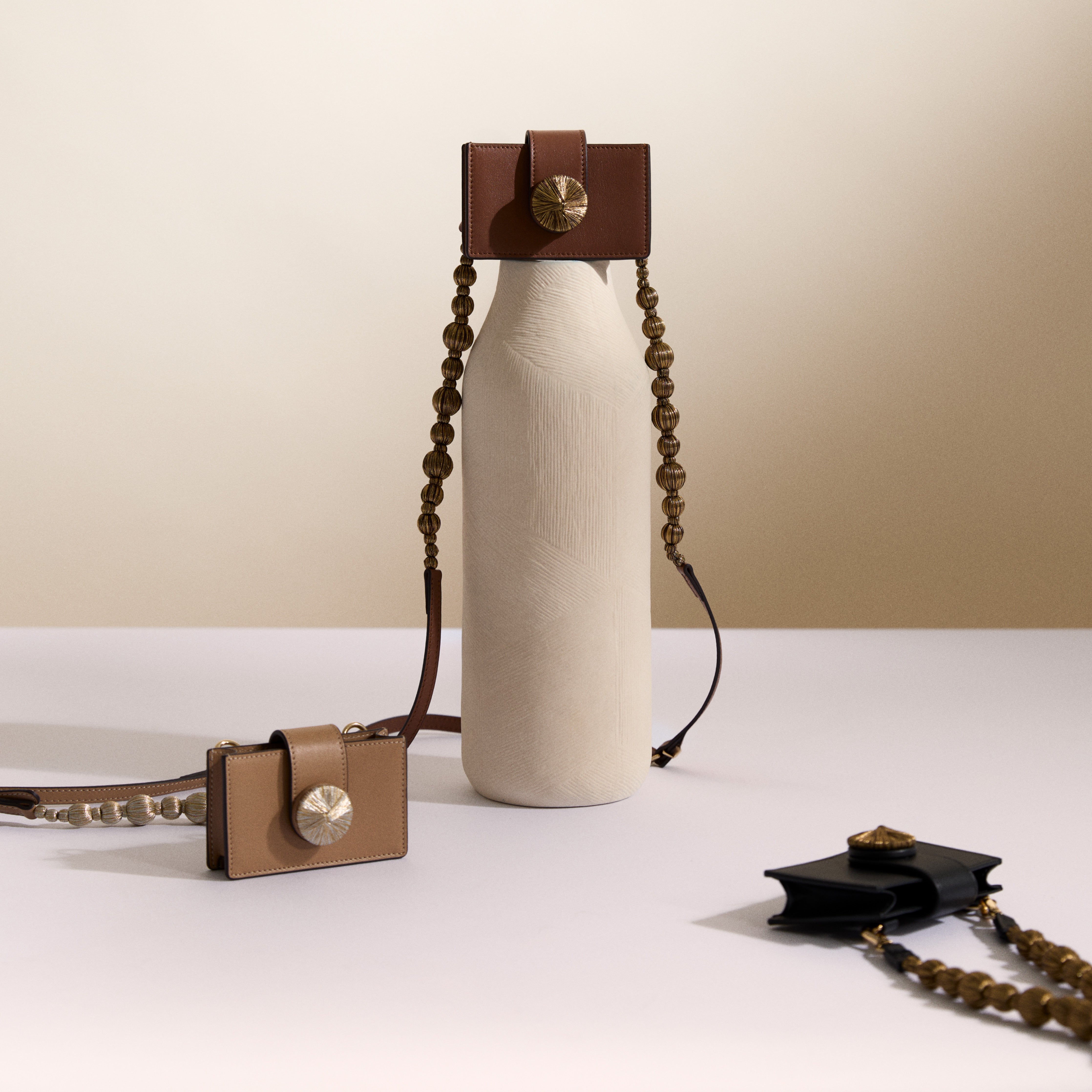 A refined accessory elevated with iconic Serena Uziyel details. Alessa card holder is crafted using traditional techniques and adorned with handcrafted elements in signature shimmering metallic threads. An embroidered disc secures the fastening, while the detachable strap is finished with delicate strings of embroidered balls—transforming a small piece into something sculptural and storied.