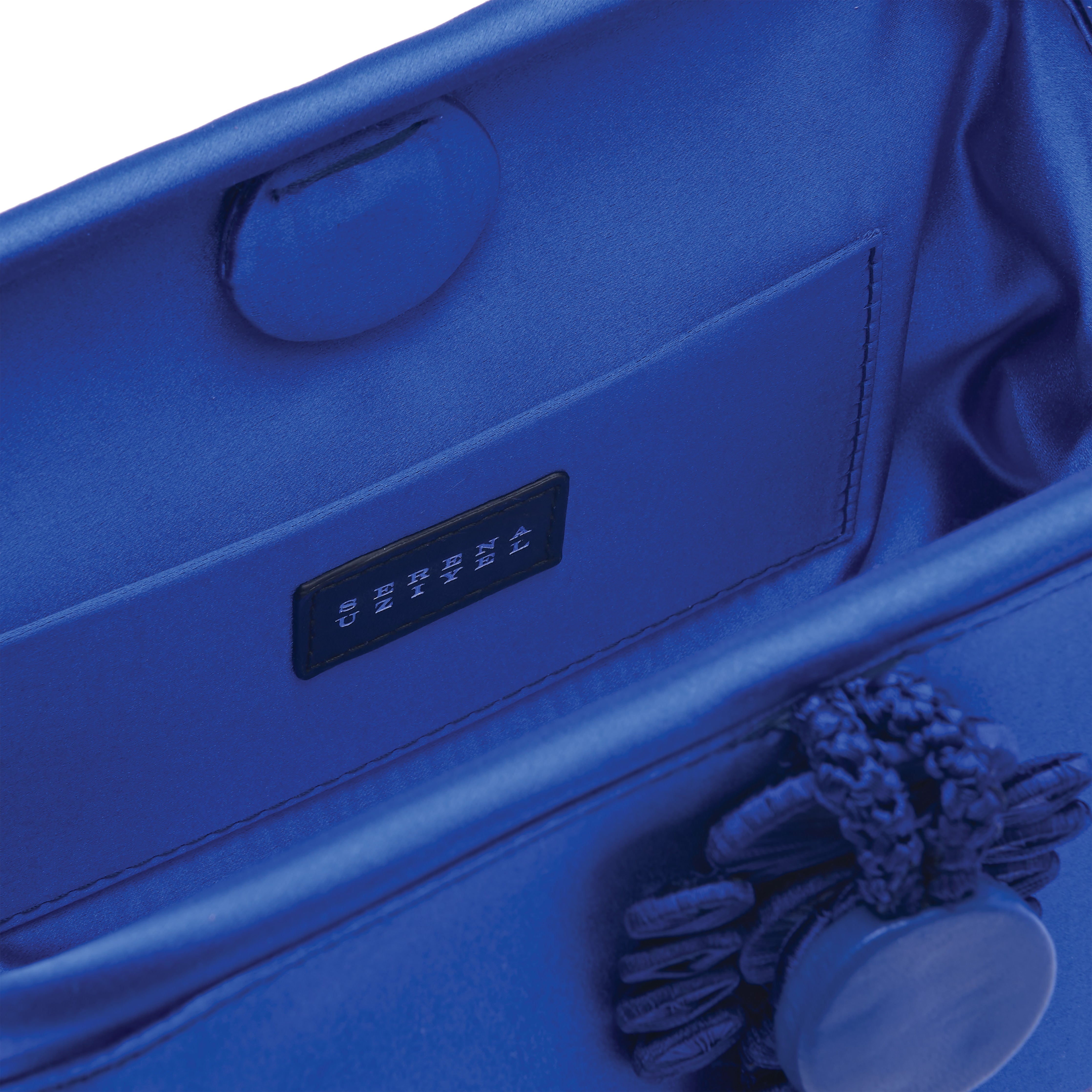 Modern sophistication and meticulous craftsmanship converge to create the Alessa Pouch Bag. Made carefully by hand, this is a clutch bag made from the finest silk-satin in a glistening shade of sapphire. An intricately knotted and layered design of thread-wrapped coins create an elegant statement, which doubles as the fastening in addition to a magnetic tab. The perfect accent to pair with an evening gown, or a bold accessory to elevate a daytime look.