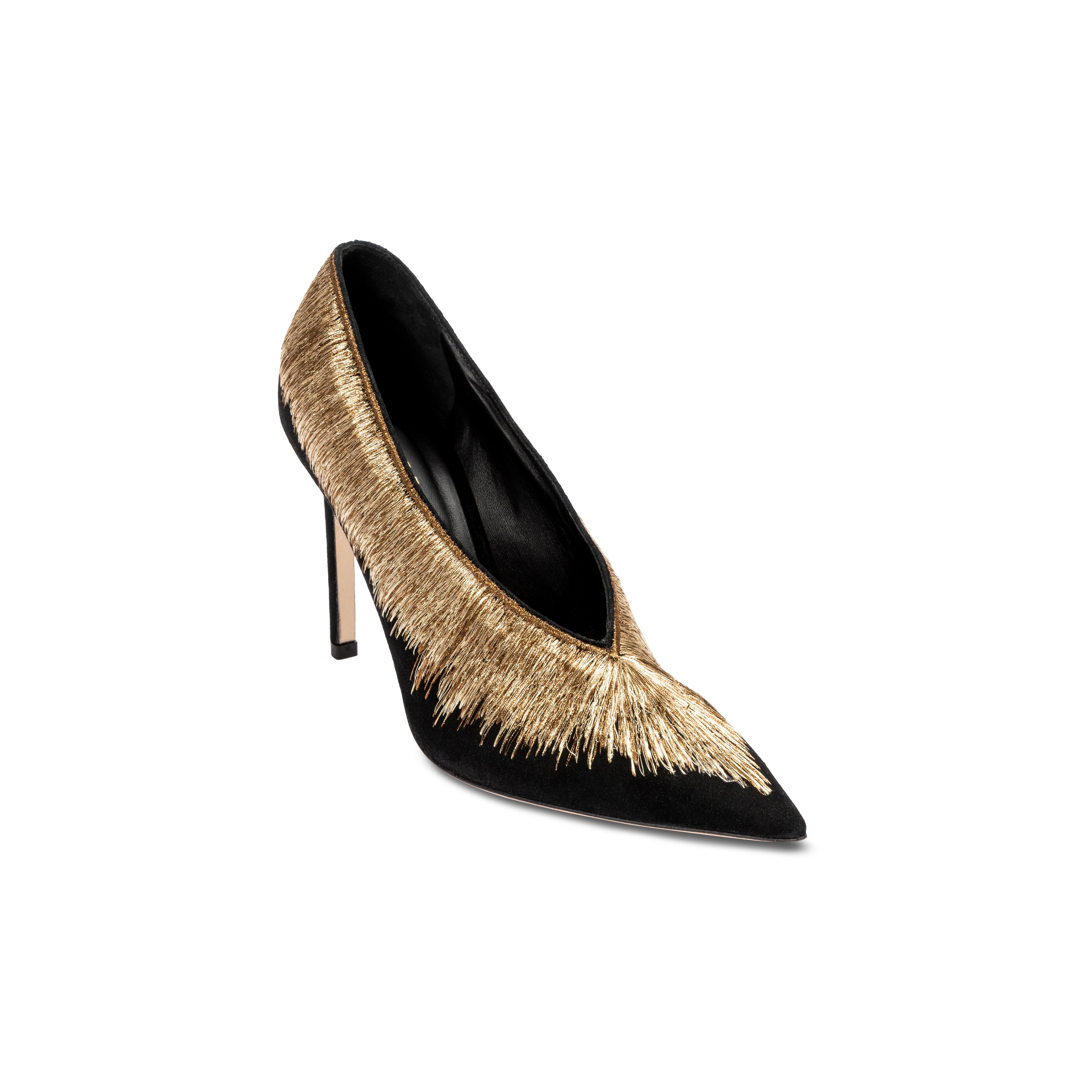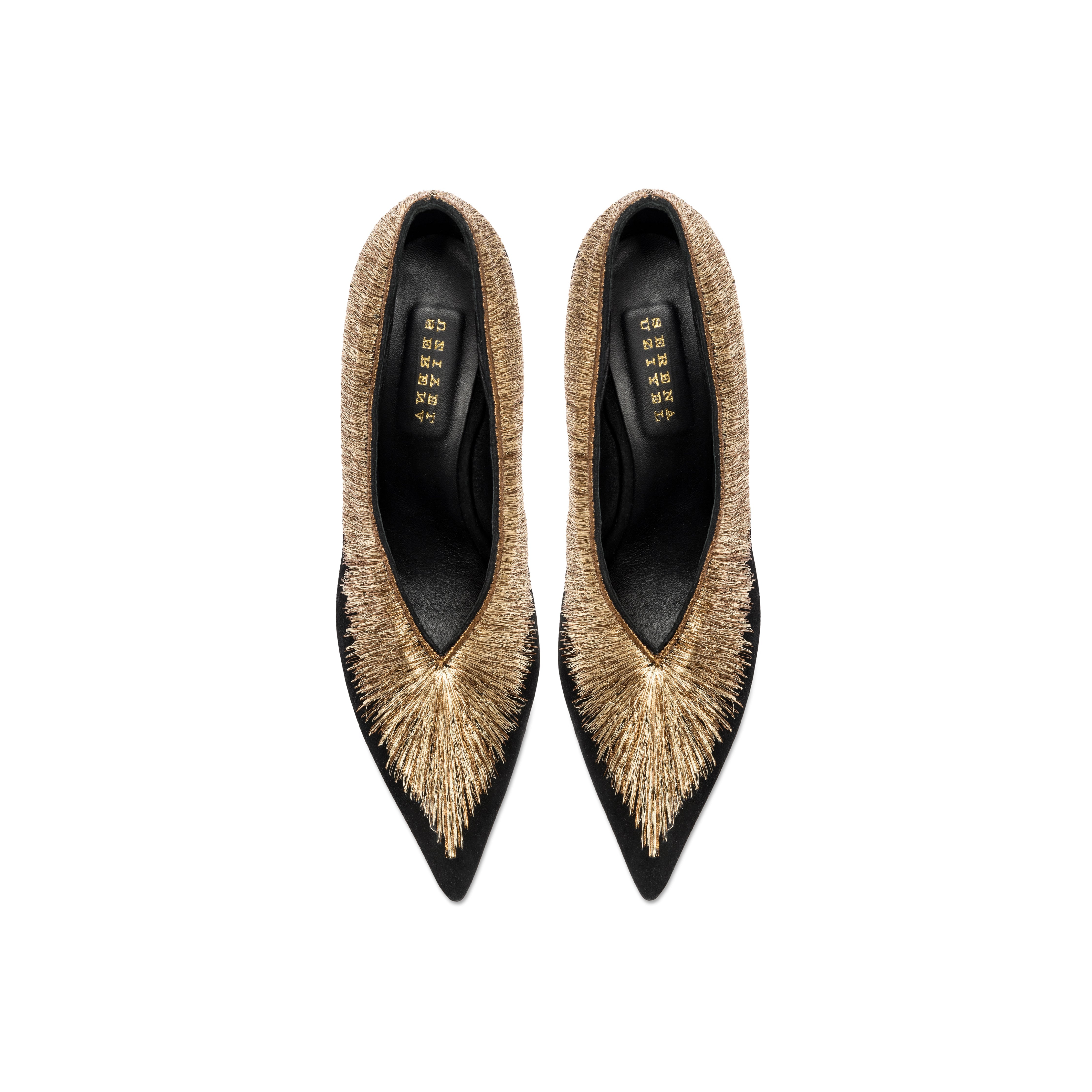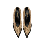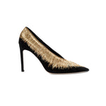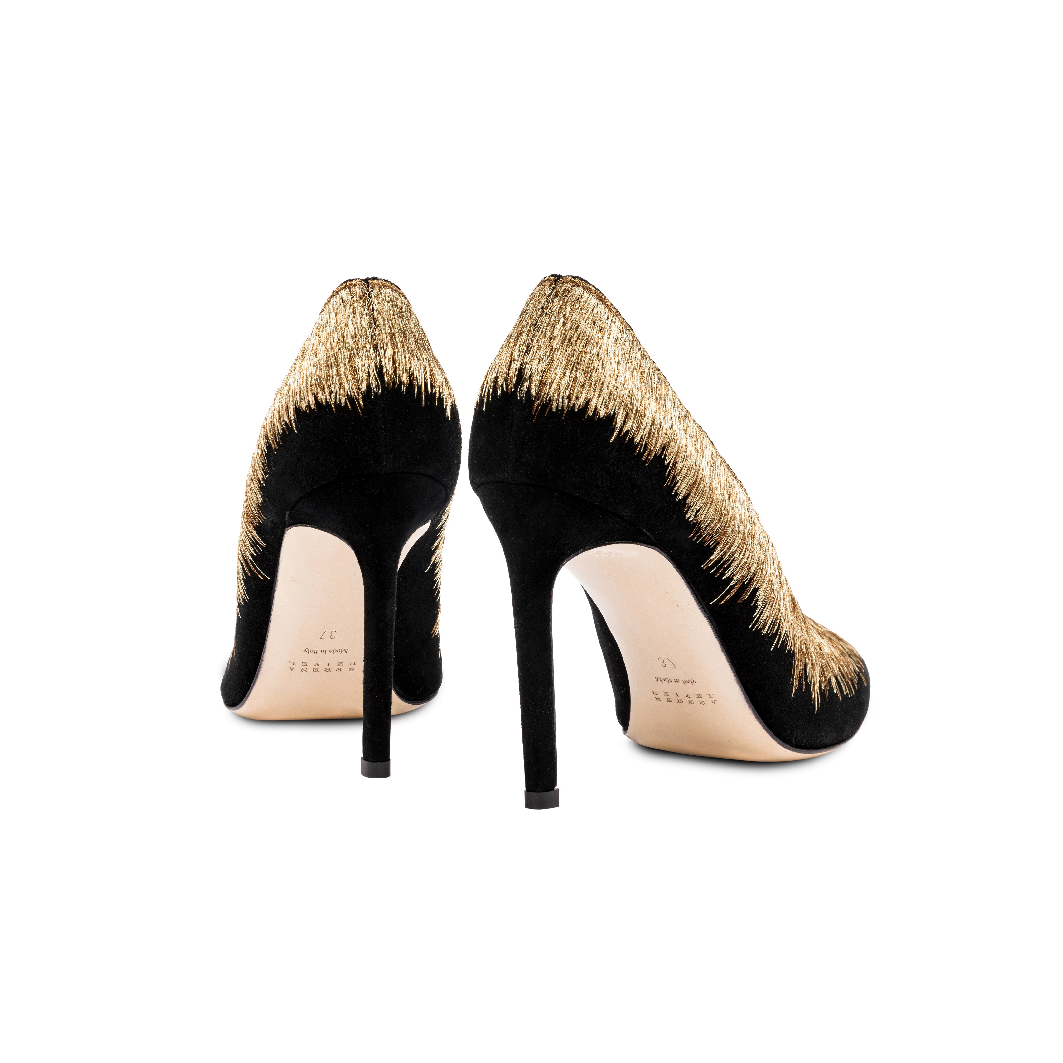 A statement piece to complete any ensemble, the Arinna Pump Sandal offers an elegant twist to a classic silhouette. Set on 90mm stiletto heels, the pumps have been expertly crafted in Italy from smooth suede and embellished with Serena UziyelÕs signature shimmering threads. From the heel all the way down to the elegantly pointed toe, the pumps are framed with intricately stitched ancient golden and bronze threads, framing the foot in a bold sunburst pattern.