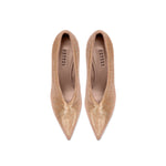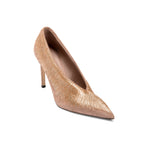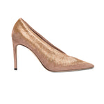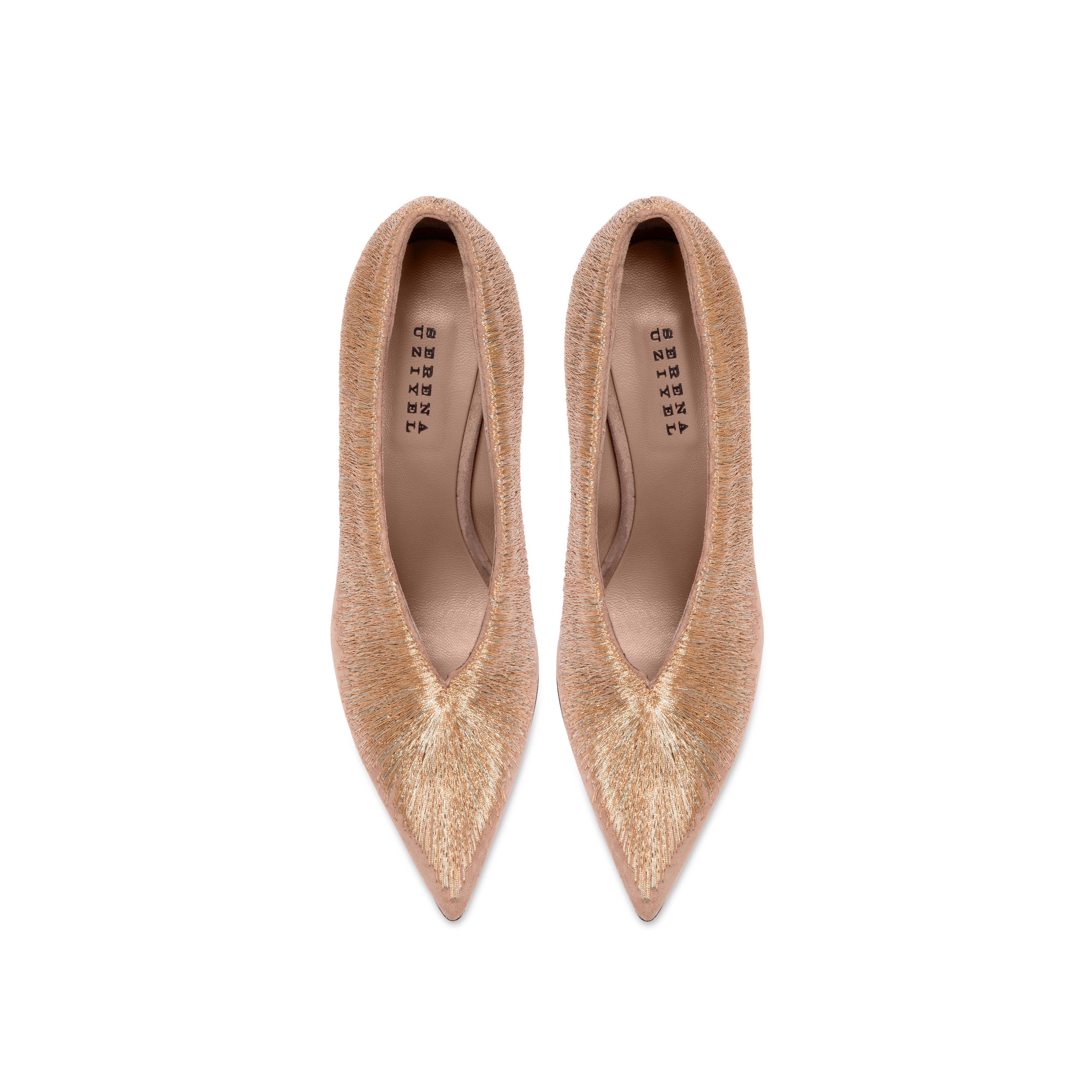 A statement piece to complete any ensemble, the Arinna Pump Sandal offers an elegant twist to a classic silhouette. Set on 90mm stiletto heels, the pumps have been expertly crafted in Italy from smooth suede and embellished with Serena UziyelÕs signature shimmering threads. From the heel all the way down to the elegantly pointed toe, the pumps are framed with intricately stitched ancient golden and bronze threads, framing the foot in a bold sunburst pattern.