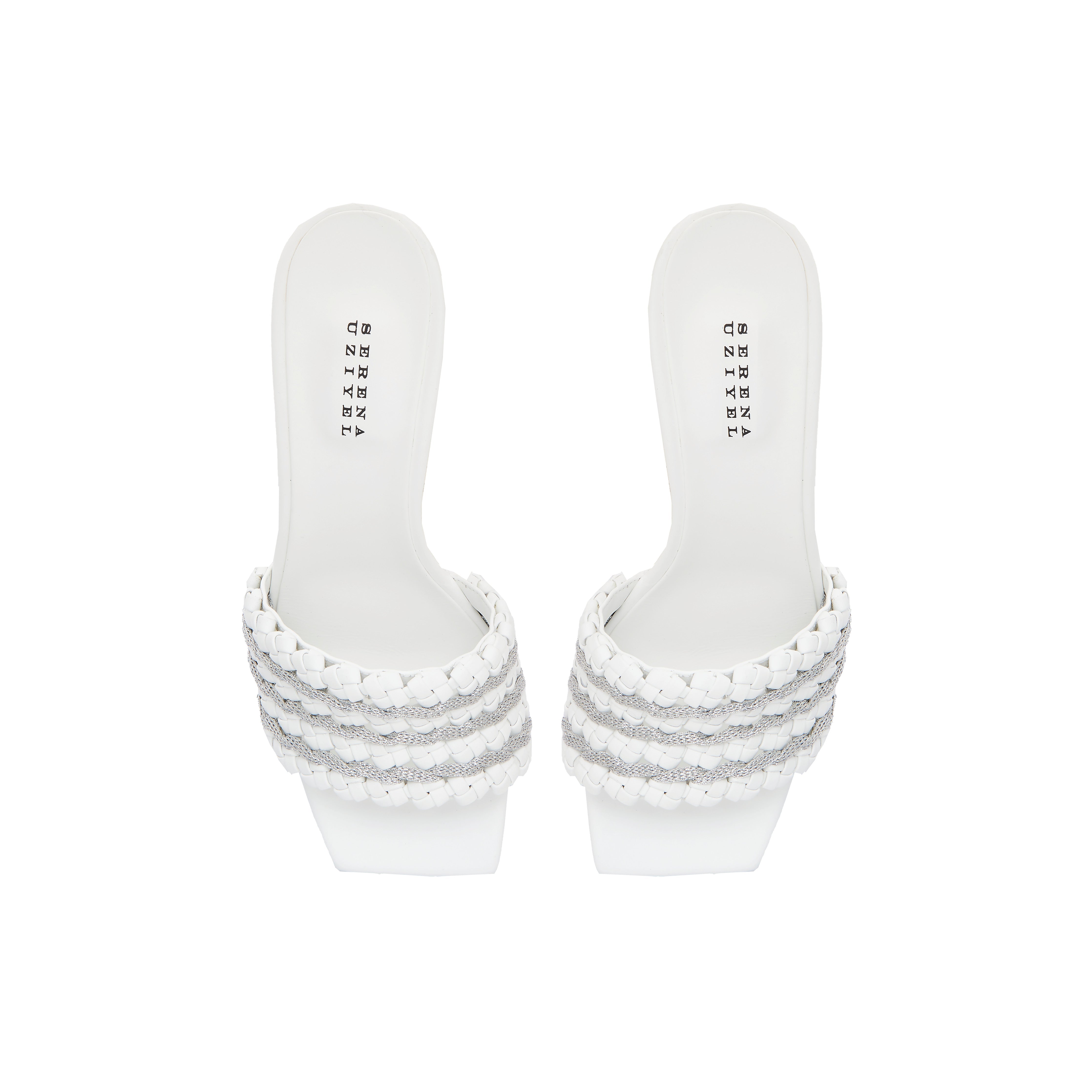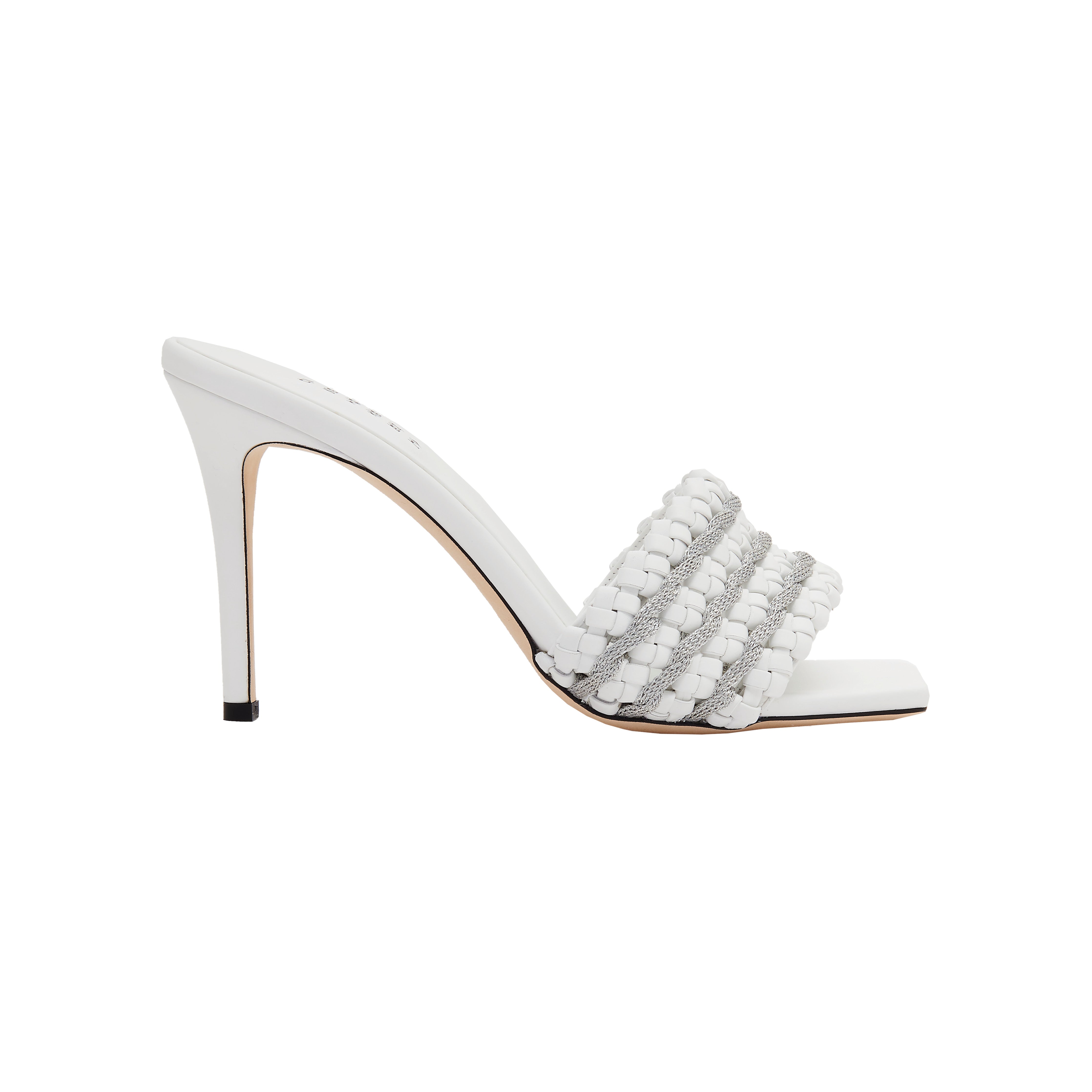 Aurnia Sandal boasts a slim silhouette highlighted by an eye-catching strap with ancient silver threads woven intricately into braided off-white leather. A blend of elegance and comfort, these sandals will complement just about any outfit, from jeans to a chic summer dress, with a squared toe and a slight 90mm heel.
