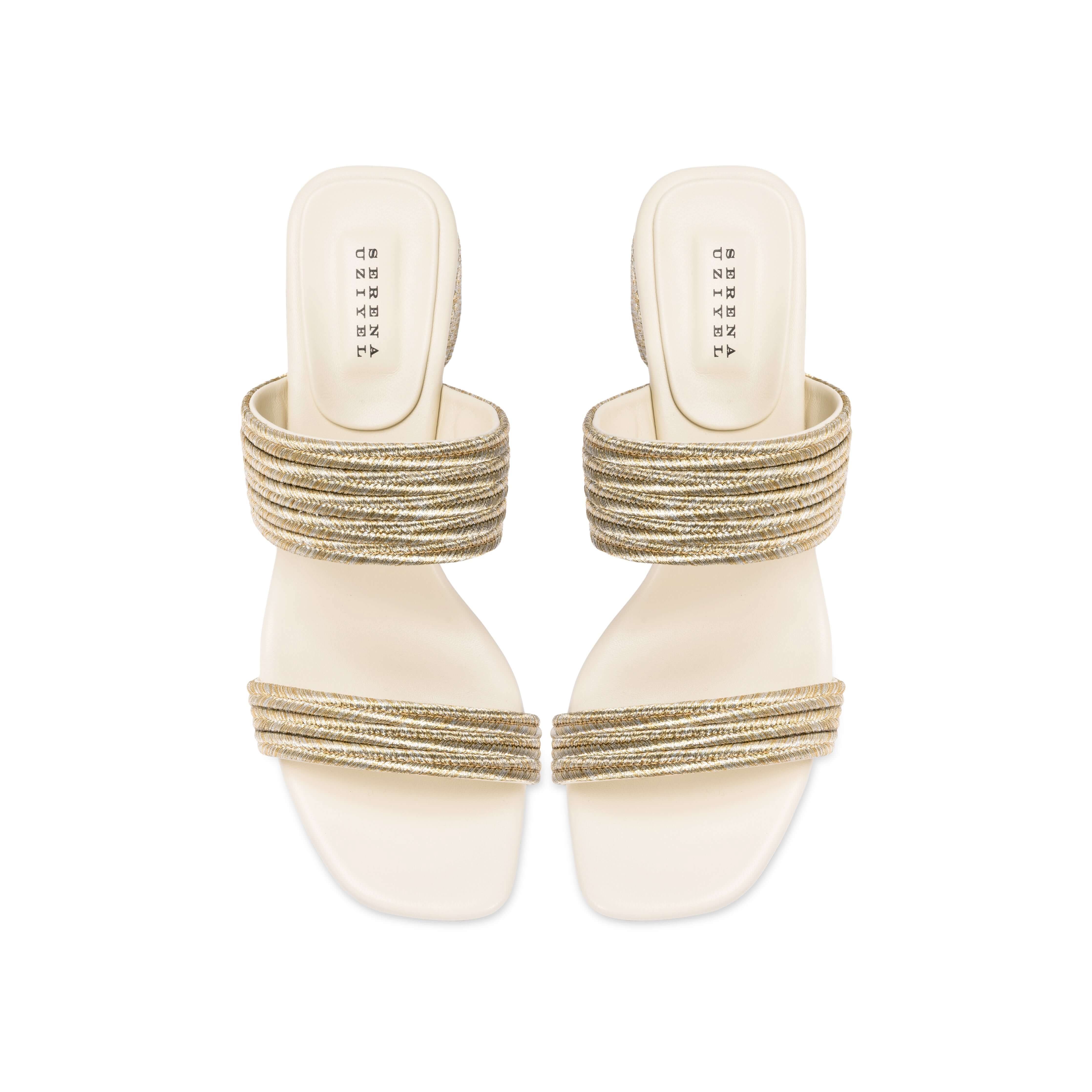 The Bellina Block Sandal offers a refined take on everyday elegance. Crafted in Italy, this sandal features two wide straps intricately braided to create a textured, three-dimensional effect, enhanced by the soft shimmer of pale antique metallic threads. Set on a 60mm block heel wrapped in matching metallic embroidery and finished with a soft ivory sole, it is a subtle yet distinctive piece for any occasion.