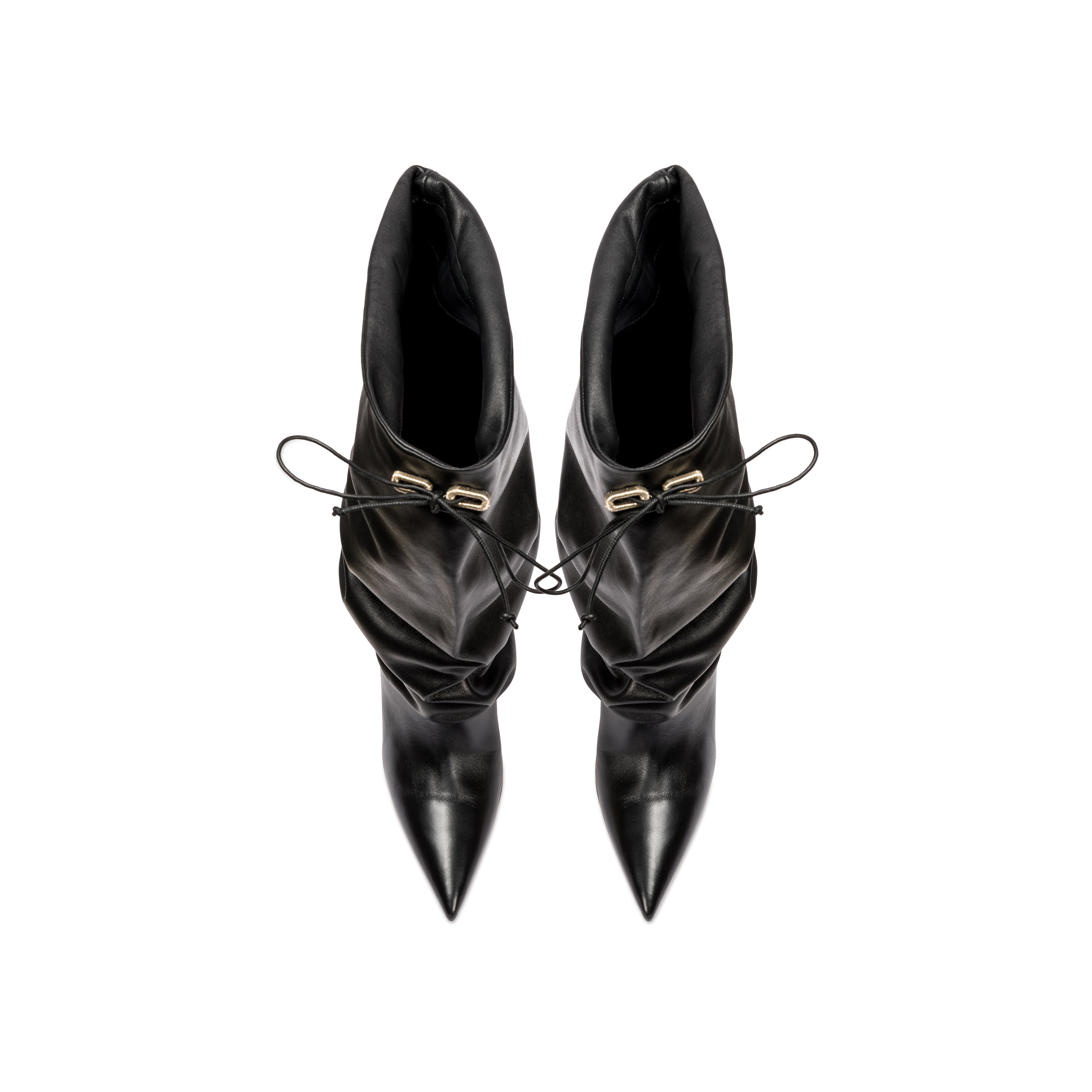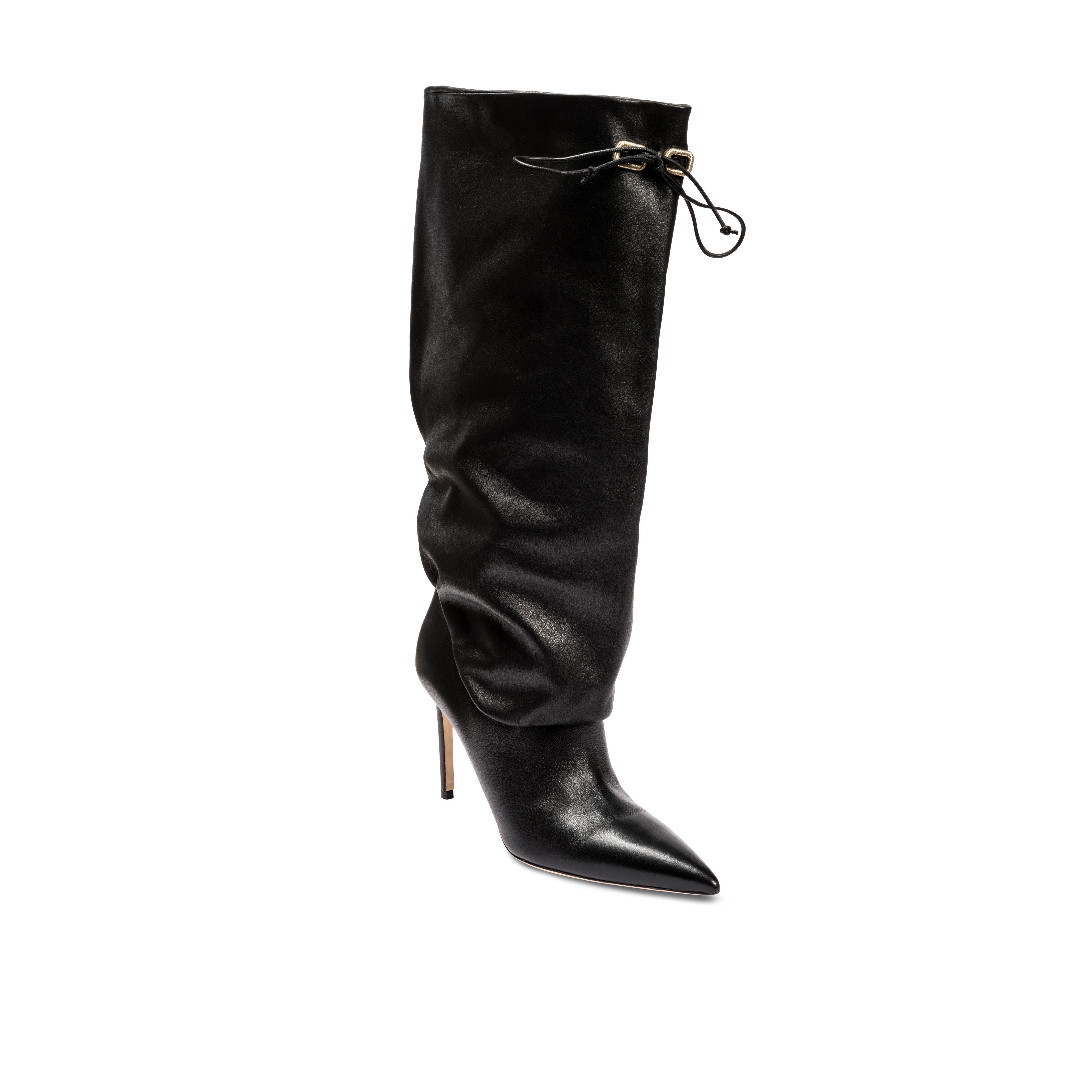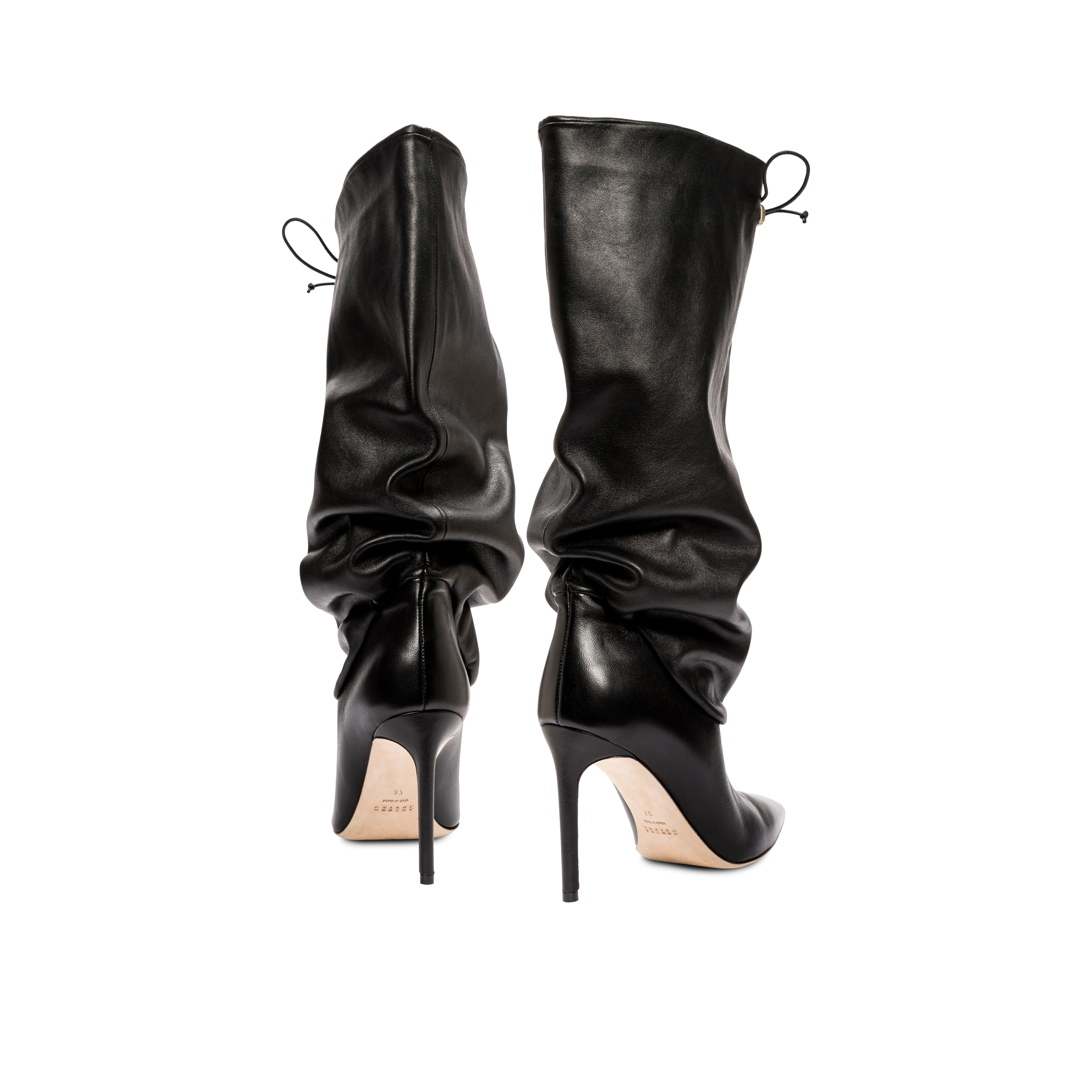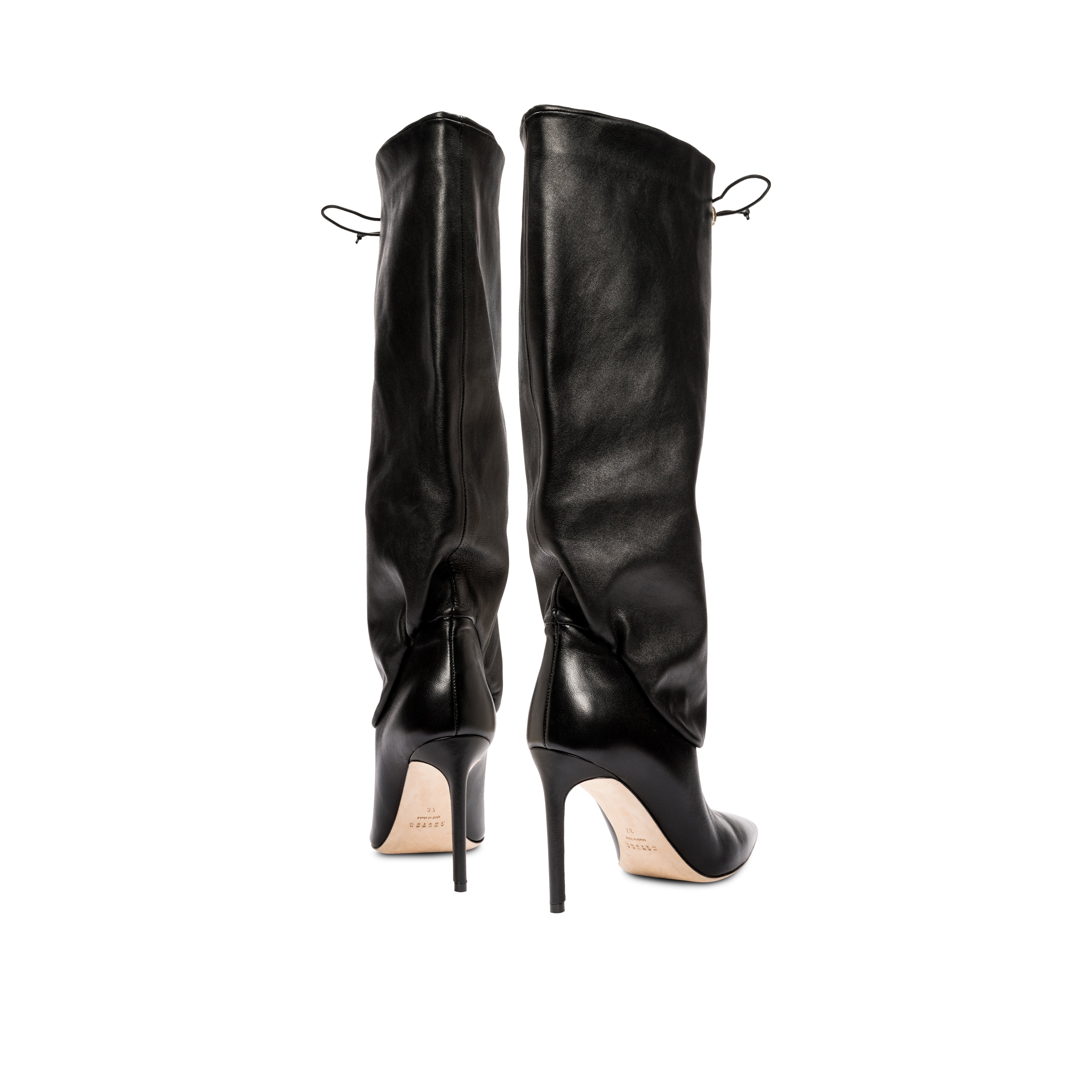 Expertly crafted in Italy from a soft camel suede or supple black leather, the Catena Notte knee-high boot features a sharply pointed toe, the silhouette of which is accentuated by a slouchy and ruched profile. A blend of luxe bohemia and sleek sophistication, the boot is set on a slender 90mm heel with a drawstring of Serena UziyelÕs signature antique metallic threads. A statement piece for cold-weather ensembles, show the Catena Notte Knee Boot off under midi and mini hemlines.