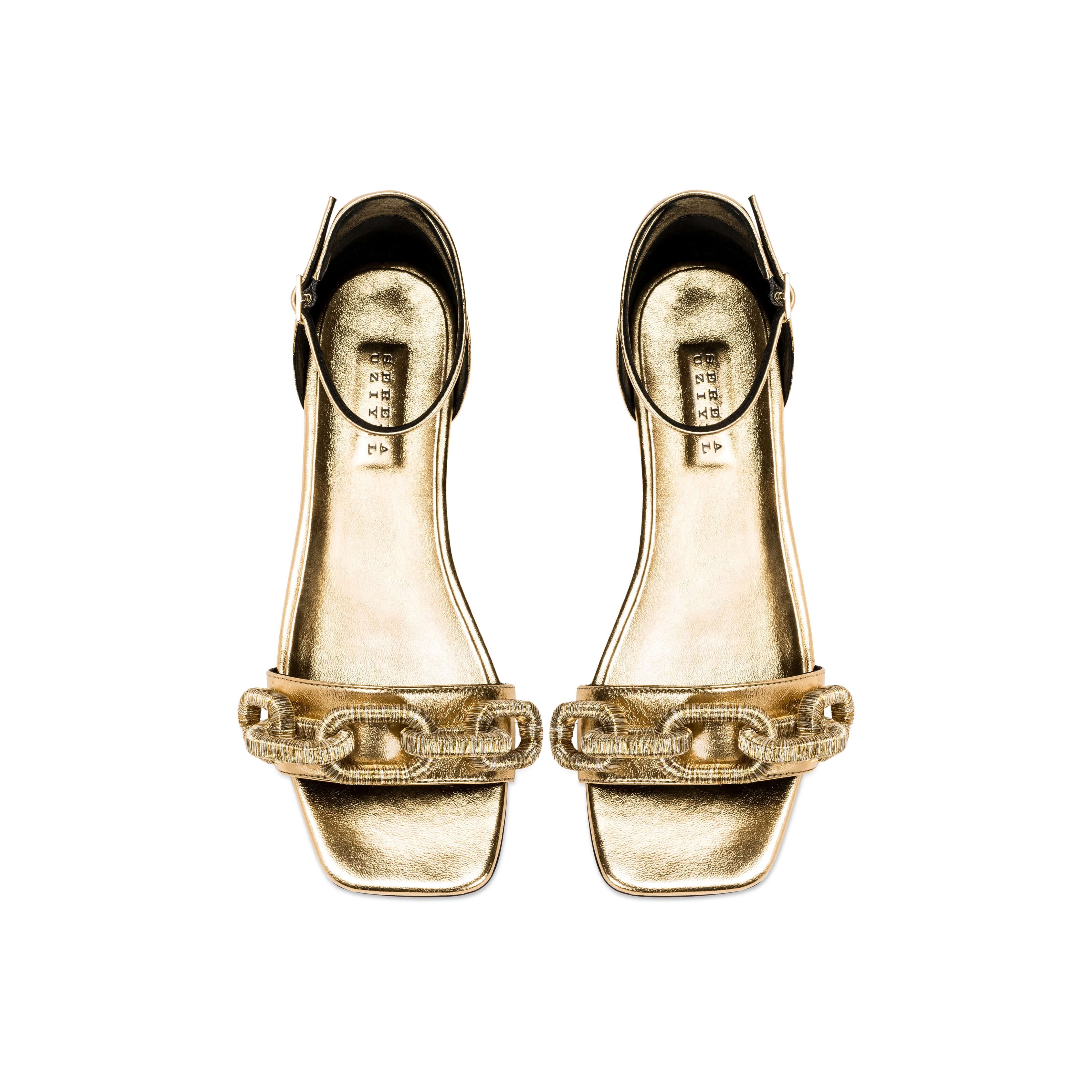 The Catena gold leather ankle sandal, meticulously crafted to offer a high level of femininity and comfort. Experience the perfect fusion of glamour and comfort with the captivating gold and silver metallic chain that embellishes the sandals. The hand-woven metallic chain adds a delightful eye-catching element exuding a sense of femininity and elegance at all times.