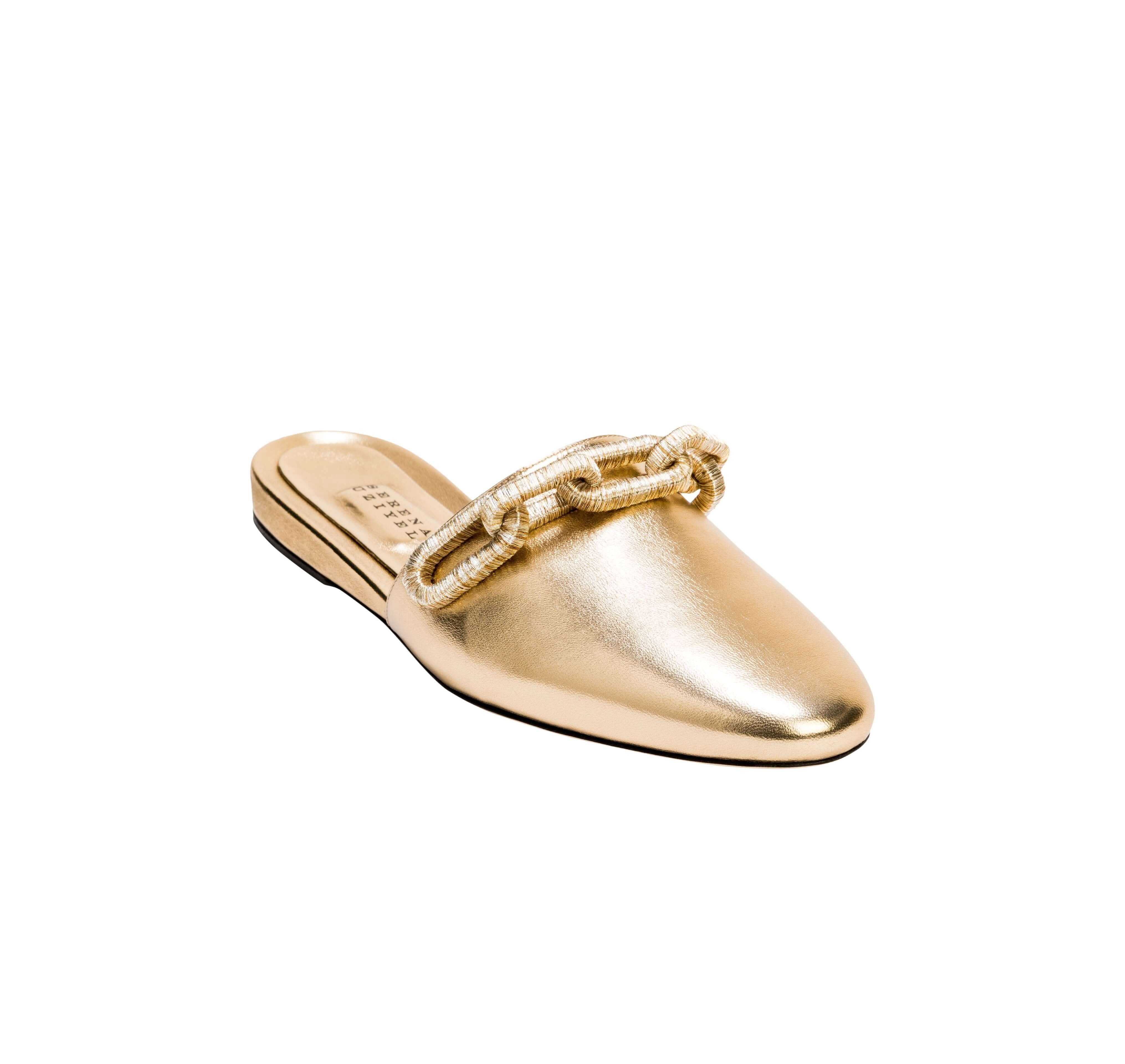 Crafted from Italian metallic gold leather, the Catena Sliperette features gold and silver threads that are bound together to create rectangular chain shaped embroidery for contrast. The flat structure and the tactility of the beautiful leather will comfort your steps with delicacy.