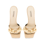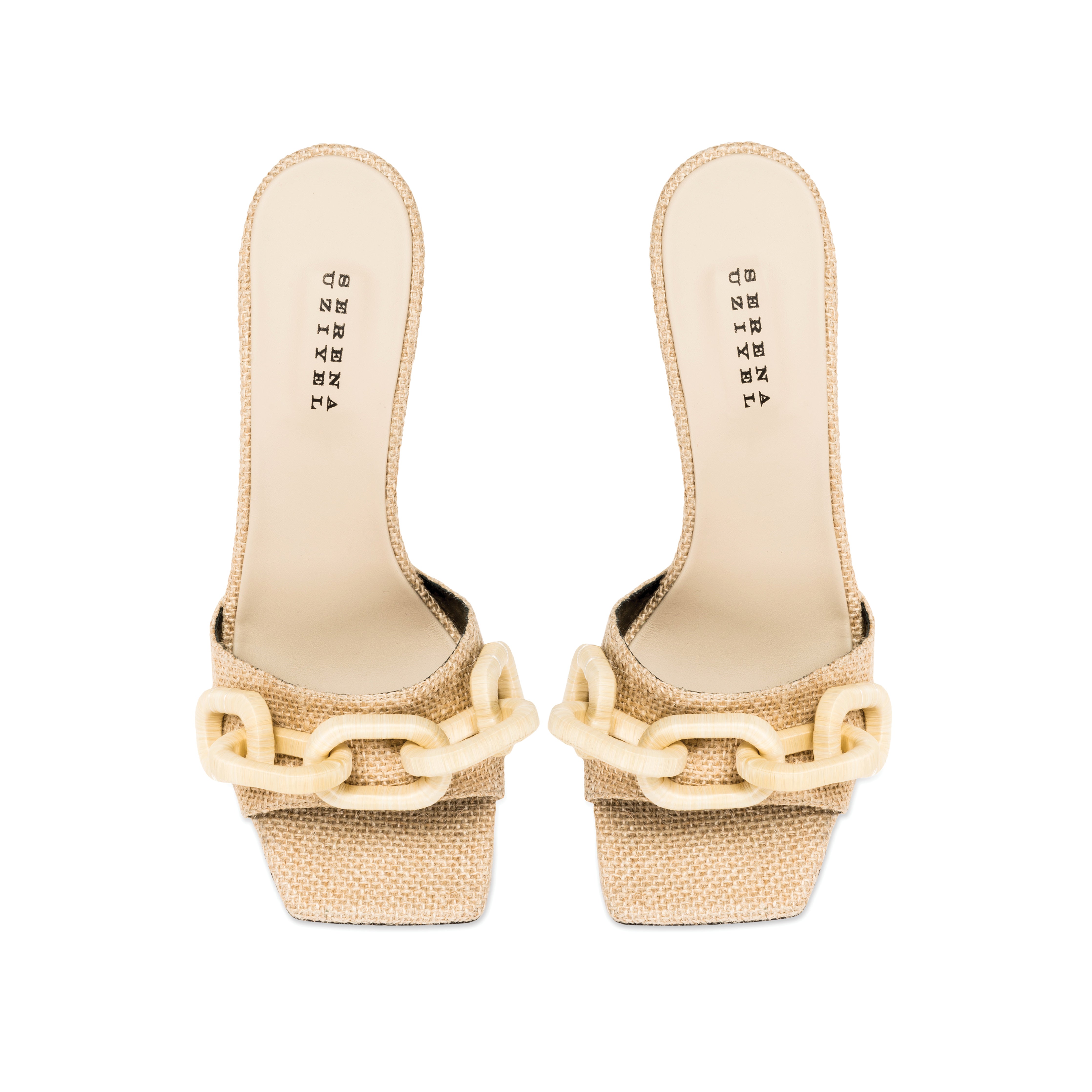 The Catena High Sandal is handcrafted and beautifully made in Italy from natural soft jute with its raffia natural chain embroidery adorning the front strap. The ninety millimeter heel offers just the right amount of lift while providing comfort and delicacy.