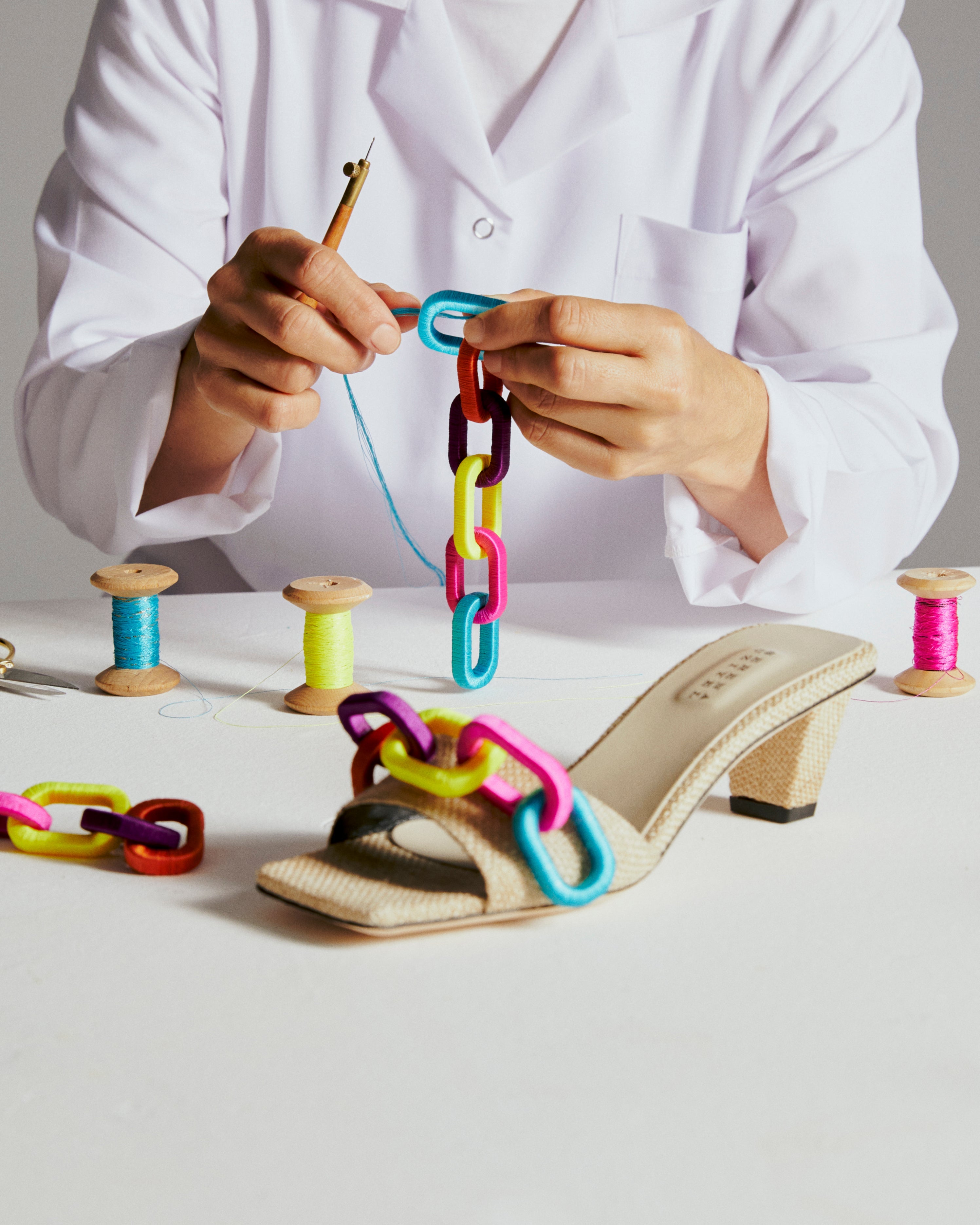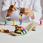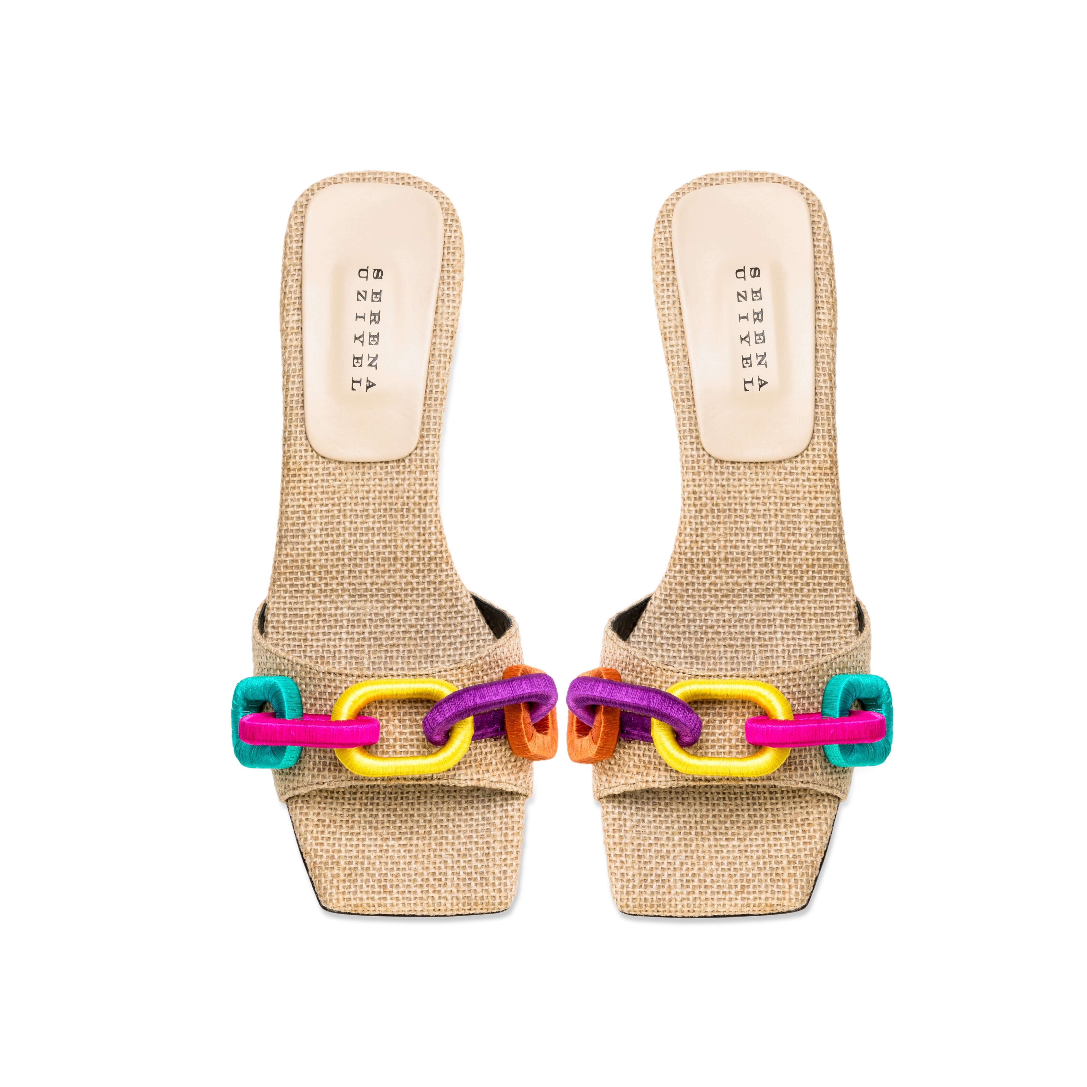 The captivating Catena sandal in natural linen, adorned with rainbow matte chain threads. With a fifty millimeters uplift, the sandals offer both comfort and elegance. Step into the spotlight with the beguiling Catena sandal and bask in the adoration of onlookers as you exude confidence and grace.