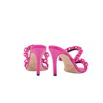 Bright, joyful, and so very chic, the Catena Notte Fuchsia High-Heel Two Strap Sandals exude confidence and grace with every step. Meticulously crafted in Italy from vibrant fuchsia satin, the slender silhouette features an open toe and two straps adorned in dainty Catena chain link embroidery which wrap around the foot with magnetic allure. A pi�ce de rŽsistance for your wardrobe, these will command attention wherever you go.