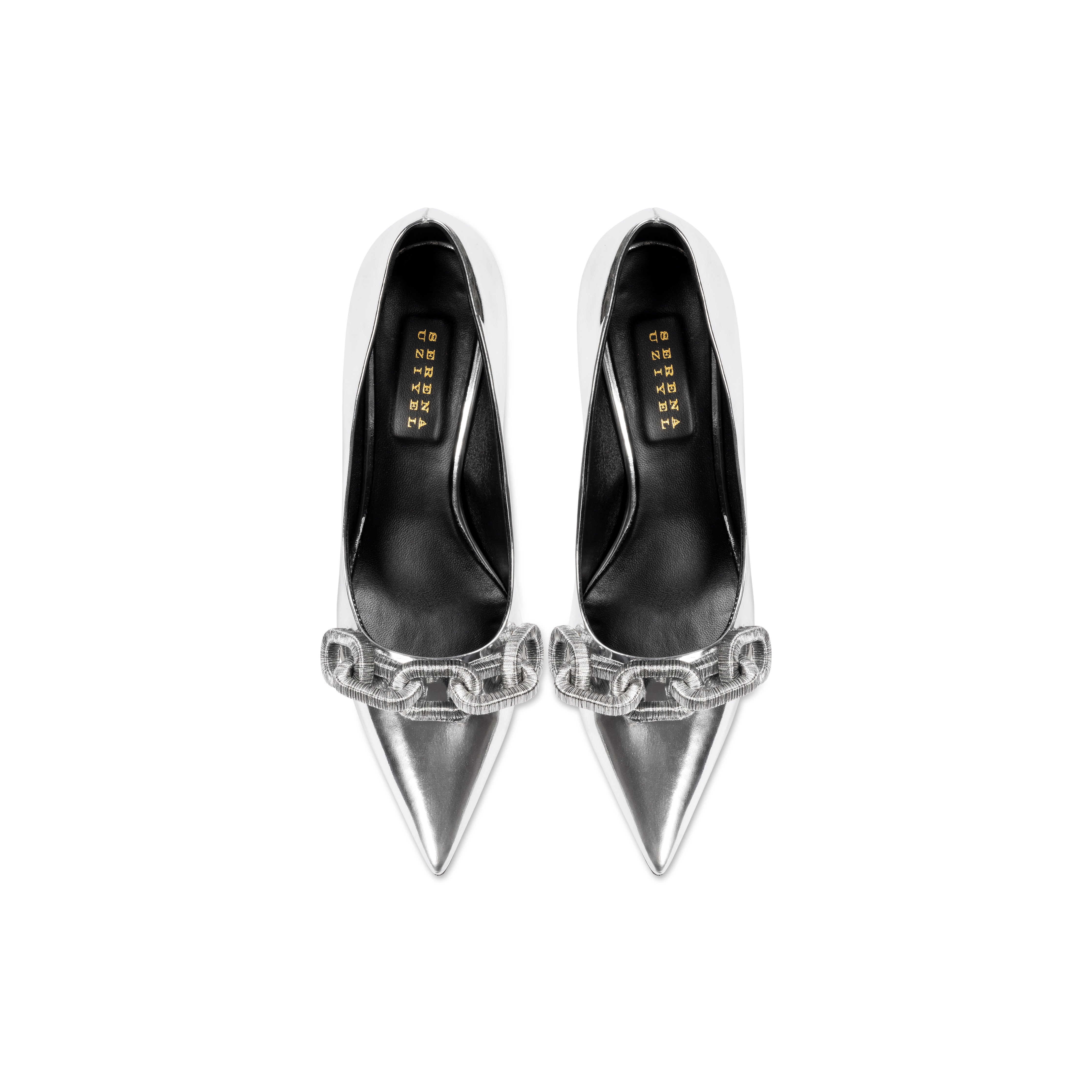 Handcrafted in Italy from glossy silver leather, the Catena Pumps feature a sleek pointed toe set on a slim 70mm stiletto heel. A result of Impeccable craftsmanship and timeless design, the pumps are detailed with a brand new iteration of Serena UziyelÕs signature Catena chain links, this time delicately wrapped in threads of sumptuous suede. Classic and easy to style, the pumps are ideal to pair with anything from tailoring to midi dresses.
