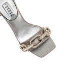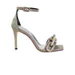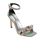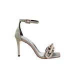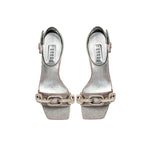 The Catena High Ankle Sandal’s provide a subtle and chic look. The shiny glitter body goes harmoniously with the antique silver, creating an elegant refinement. The antique silver chain embroidery brings luminosity with contrast to the shoe. It’s ninety millimeter heel offers just the right amount of lift providing comfort and delicacy.