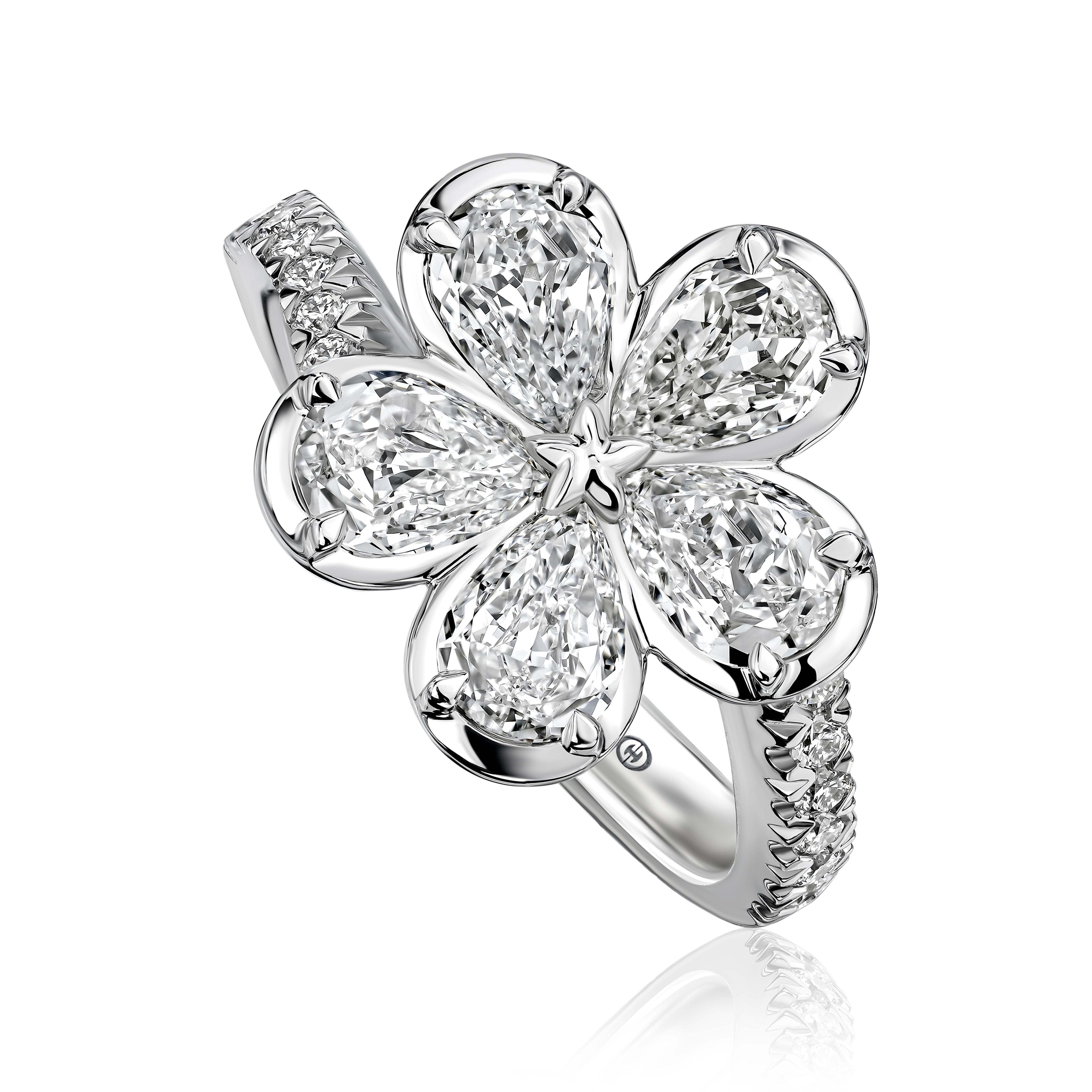 Christopher Designs flower bypass ring featuring 5 L'Amour Crisscut® pear-shape lab-grown diamonds 1.60cttw GVS and 14 Crisscut® round lab-grown diamonds 0.23cttw GVS, set in 14k white gold.