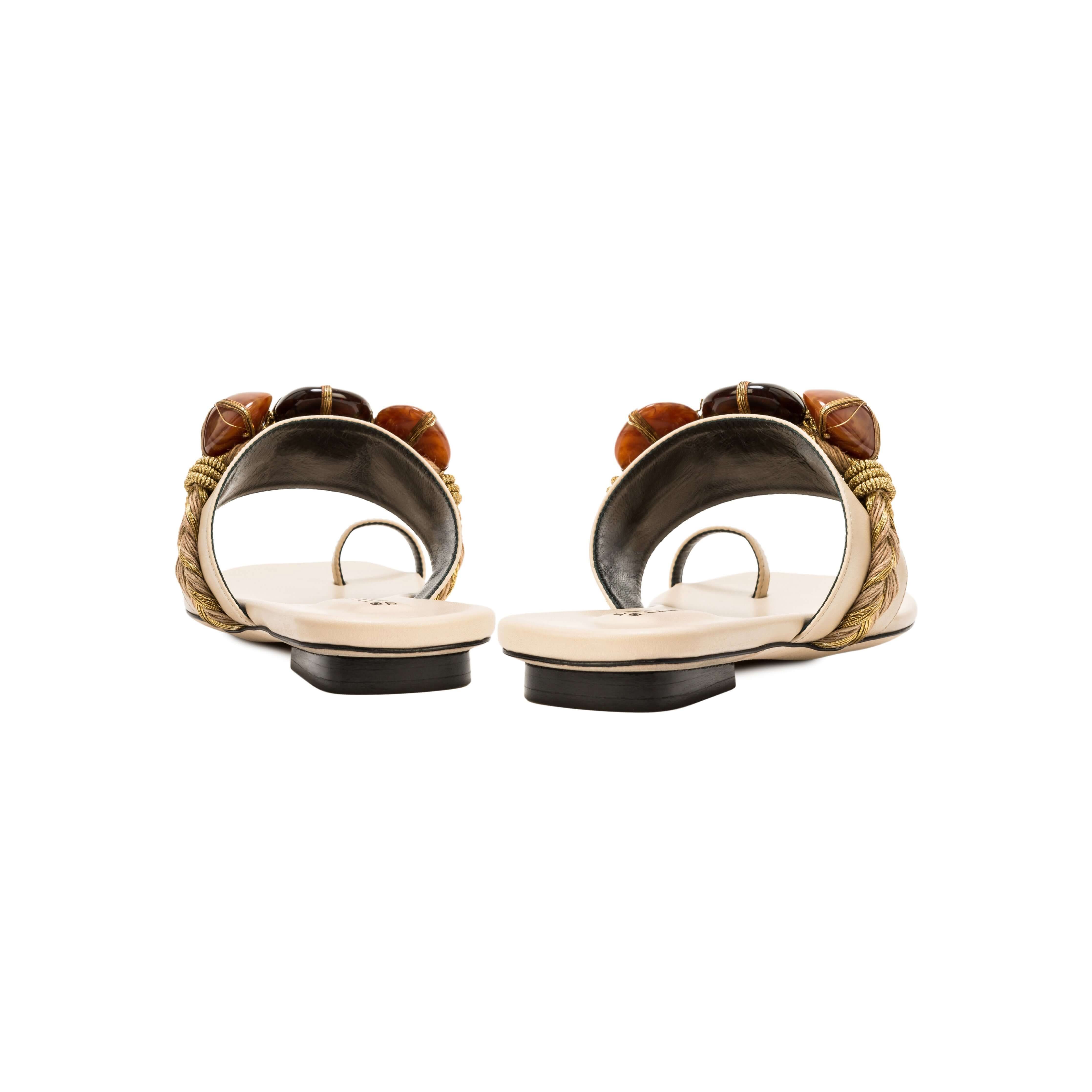 Earth-colored shiny beads playfully dance around the top of our Italian Delphine toe sandals, artfully strung on a rope along the top of a comfortable wide front strap. Reminiscent of the natural beauty of Mother Earth, the Delphine sandals embrace the tranquility of the sand and forest with their interplay of serene rustic shades and a neutral color palette.