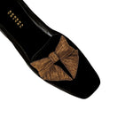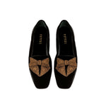The Fiocco Moccasin is uniquely crafted and structured for comfort. Each pair is hand made with unique texture and skill. The bow symbolizes strength, unity, and beauty, and is shaped with antique gold metallic embroidery on top of the black velvet Moccasin. The Fiocco Flat Moccasins are an undeniably chic accessory to have this fall.