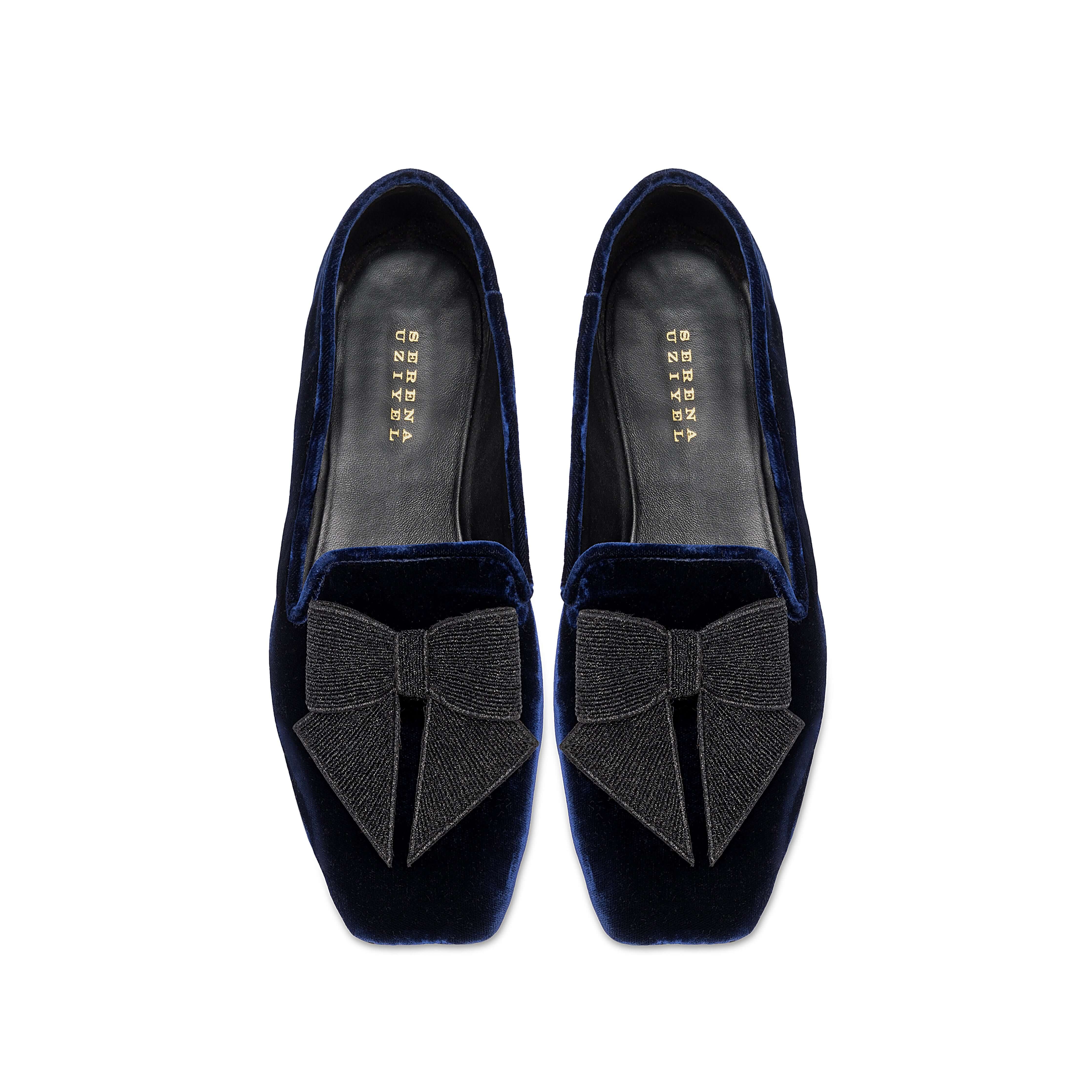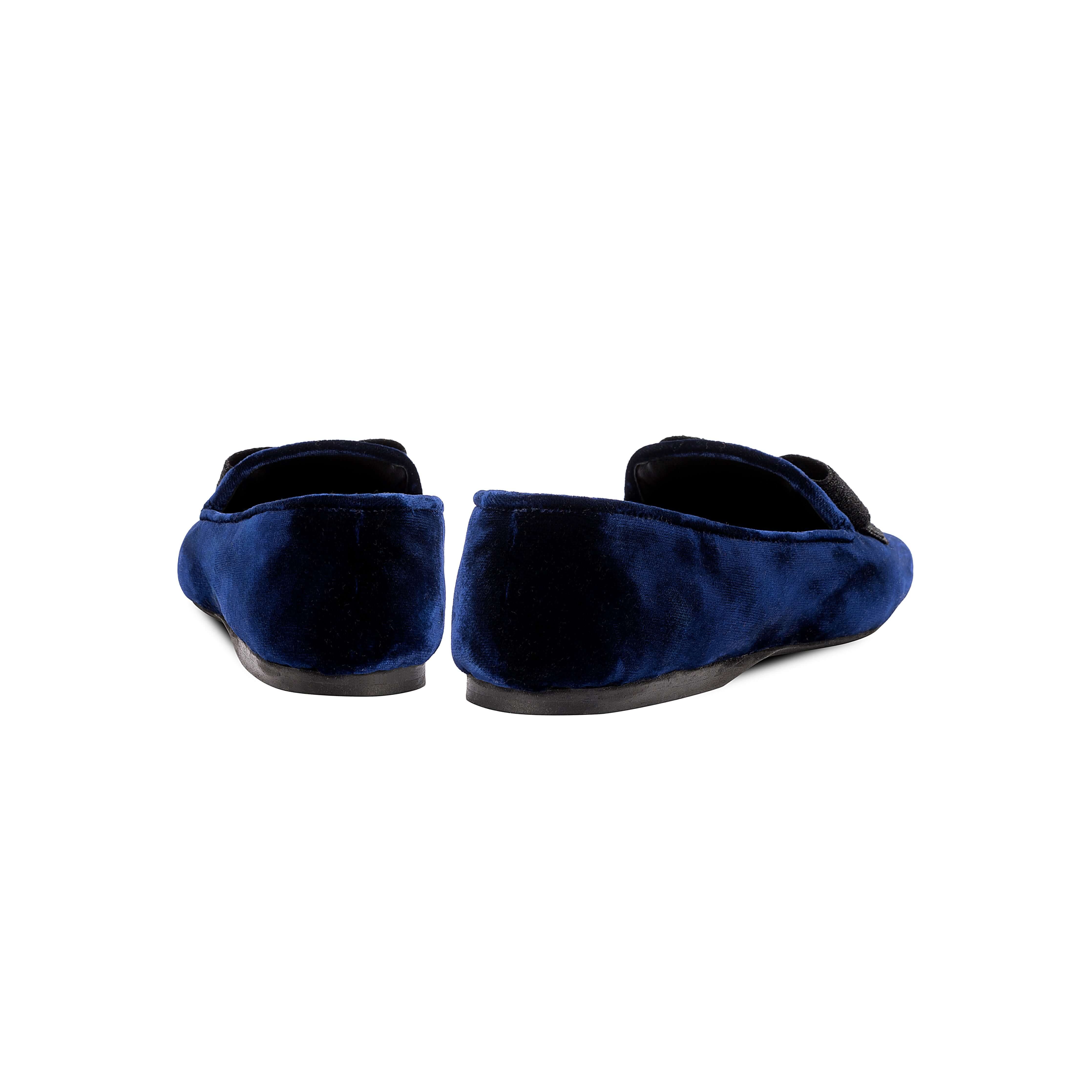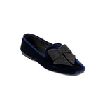The Fiocco Moccasin is uniquely crafted and structured for comfort. Each pair is hand made with unique texture and skill. The bow symbolizes strength, unity, and beauty, and is shaped with black embroidery on top of the navy velvet Moccasin. The Fiocco Flat Moccasins are an undeniably chic accessory to have this fall.