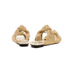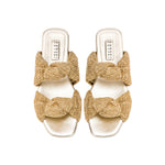 The Rhea Two-Strap Flat Sandal blends artisanal craftsmanship with effortless elegance. Handmade using centuries-old techniques, this design features two intricately knotted crochet leather straps, creating a sculptural, three-dimensional effect enhanced by the rich interplay of metallic threads. Crafted from supple leather in Mekong gold, the sandal is finished with a gently cushioned leather insole for all-day comfort. A versatile essential, perfect for sightseeing on vacation or elevating warm-weather ensembles with ease.