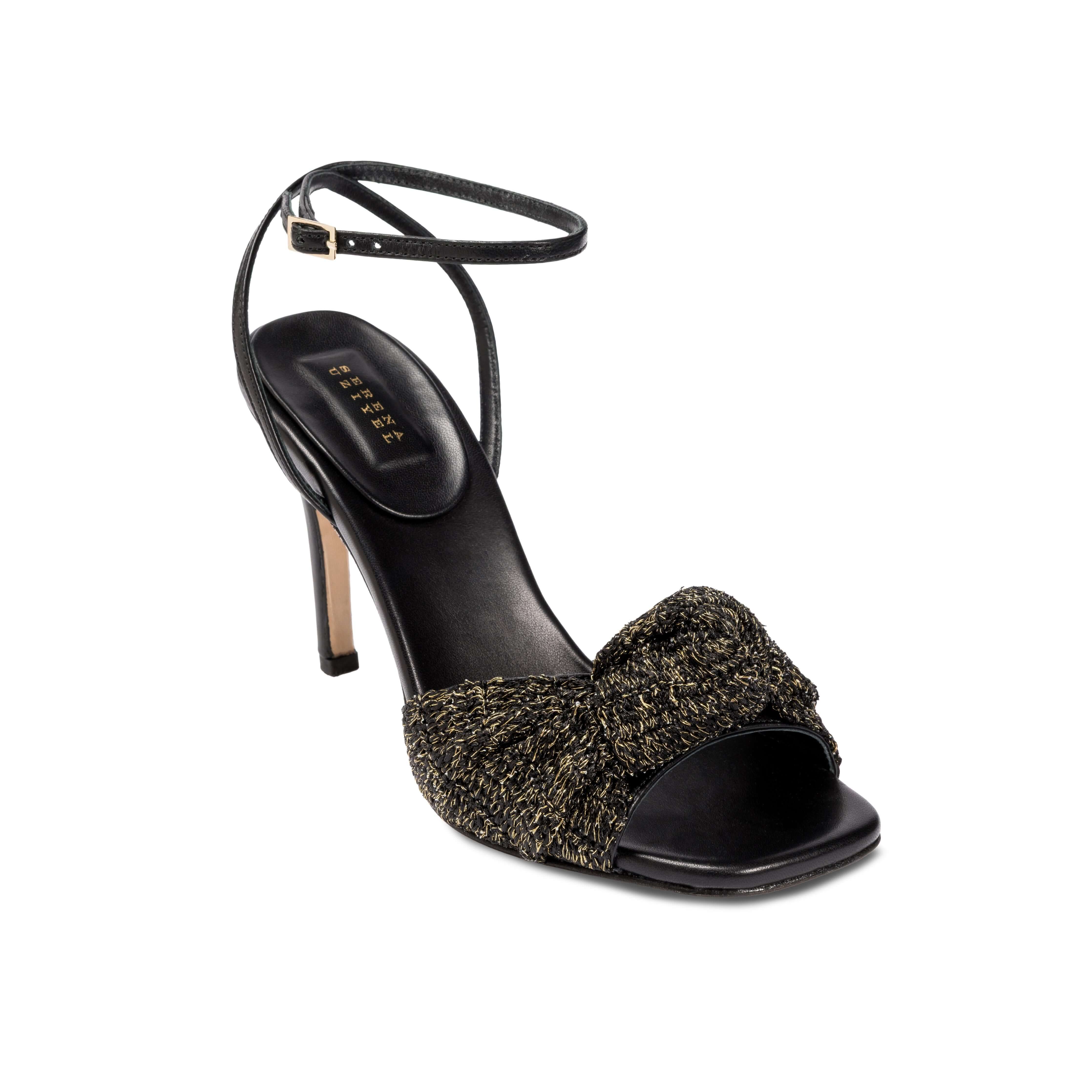 A striking blend of craftsmanship and sophistication, the Rhea Ankle Cross Sandal is crafted in Italy from smooth black leather and crochet. Its sleek silhouette is elegantly framed by slim straps that crisscross at the front, while a delicate ankle strap ensures a secure and refined fit. The standout detail—a statement front strap intricately knotted from black and gold shimmering crochet—adds texture and depth to the design. Set on a 90mm stiletto heel, this sandal is a bold yet versatile choice for any occasion.