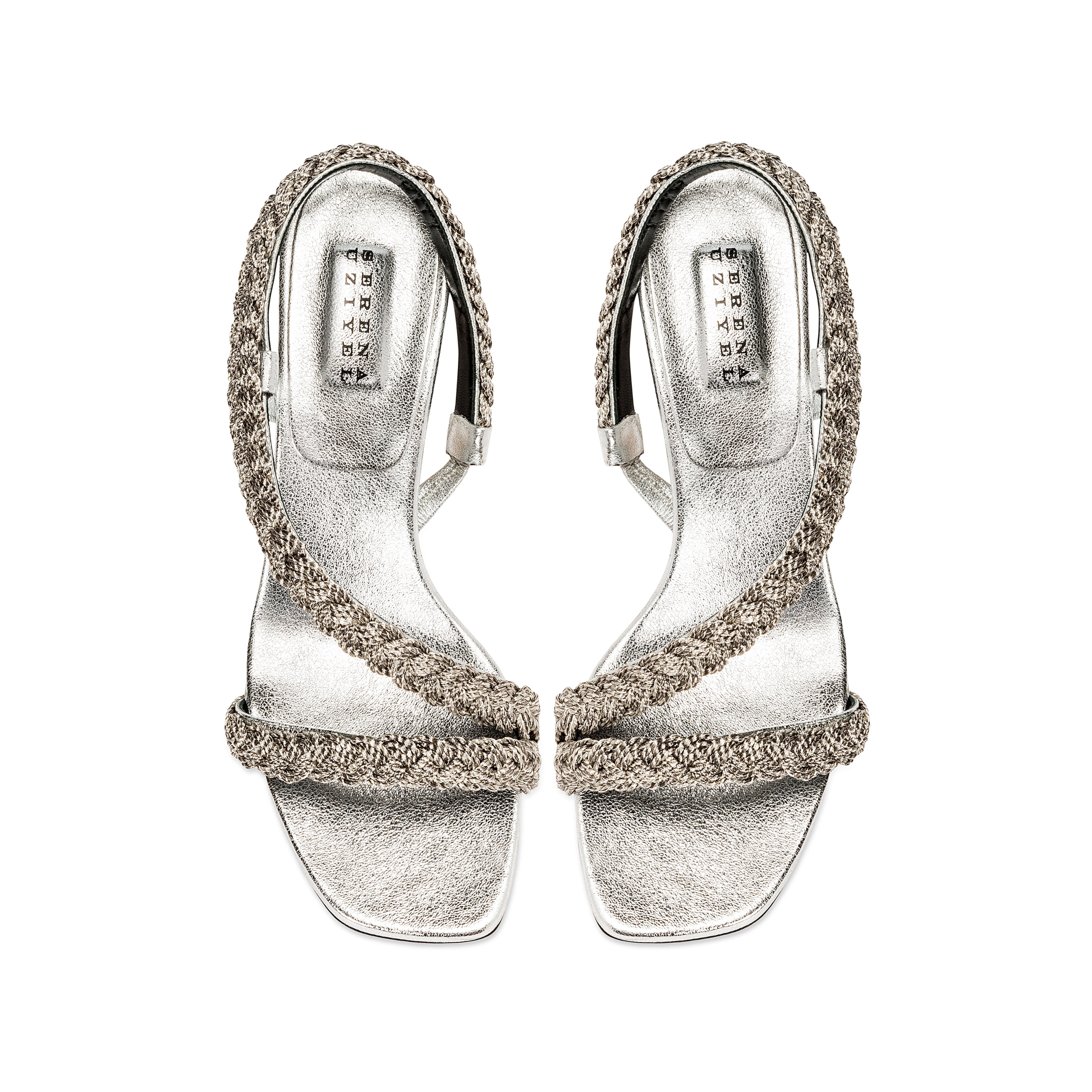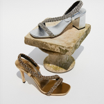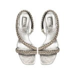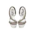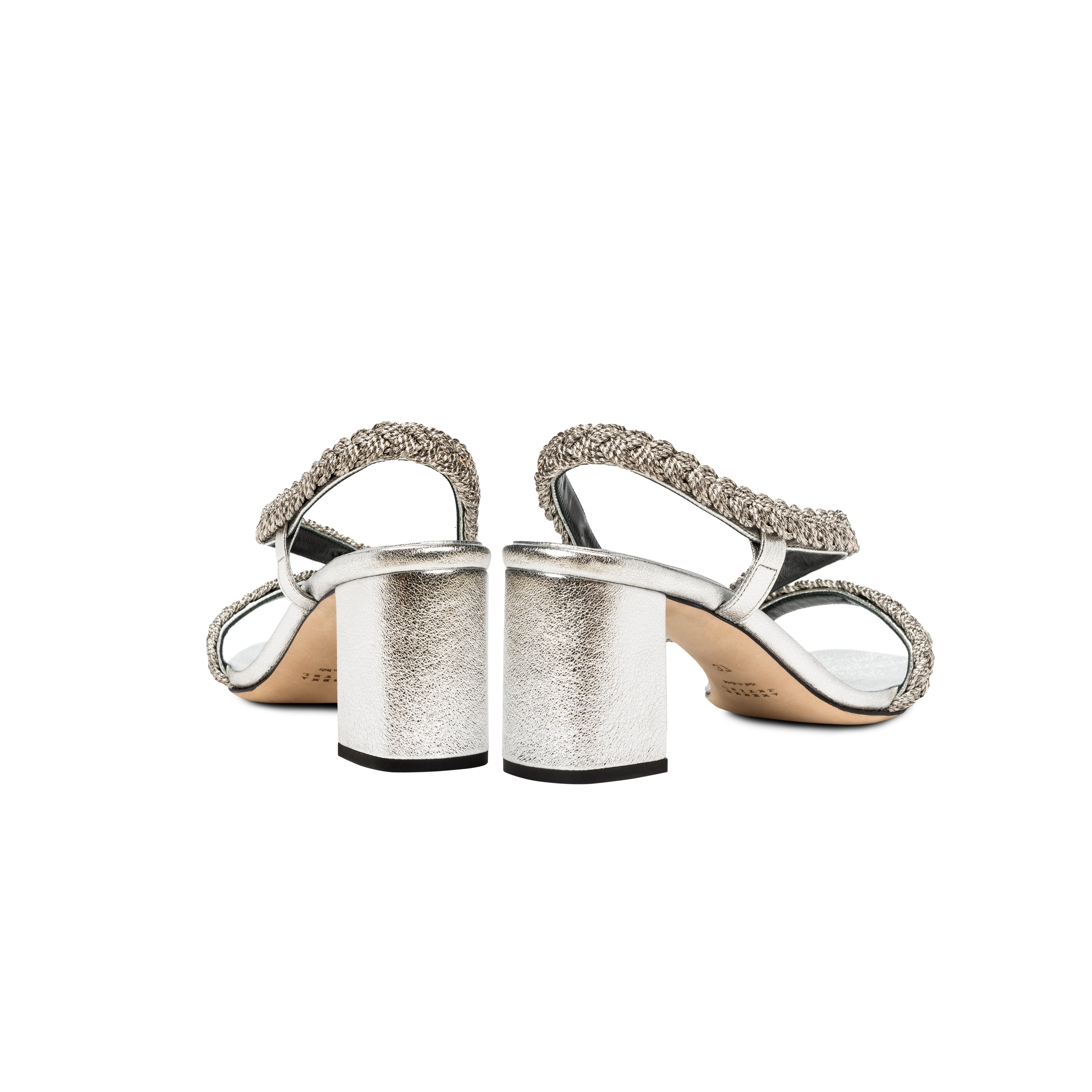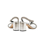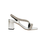 The Ronda Mid Heel Sandal features antique silver braiding thread embroidery that caresses the foot. The fifty millimeter block heel adds delicacy while the silvery Italian leather provides elegance. This shoe will add a touch of delicate refinement to any ensemble.