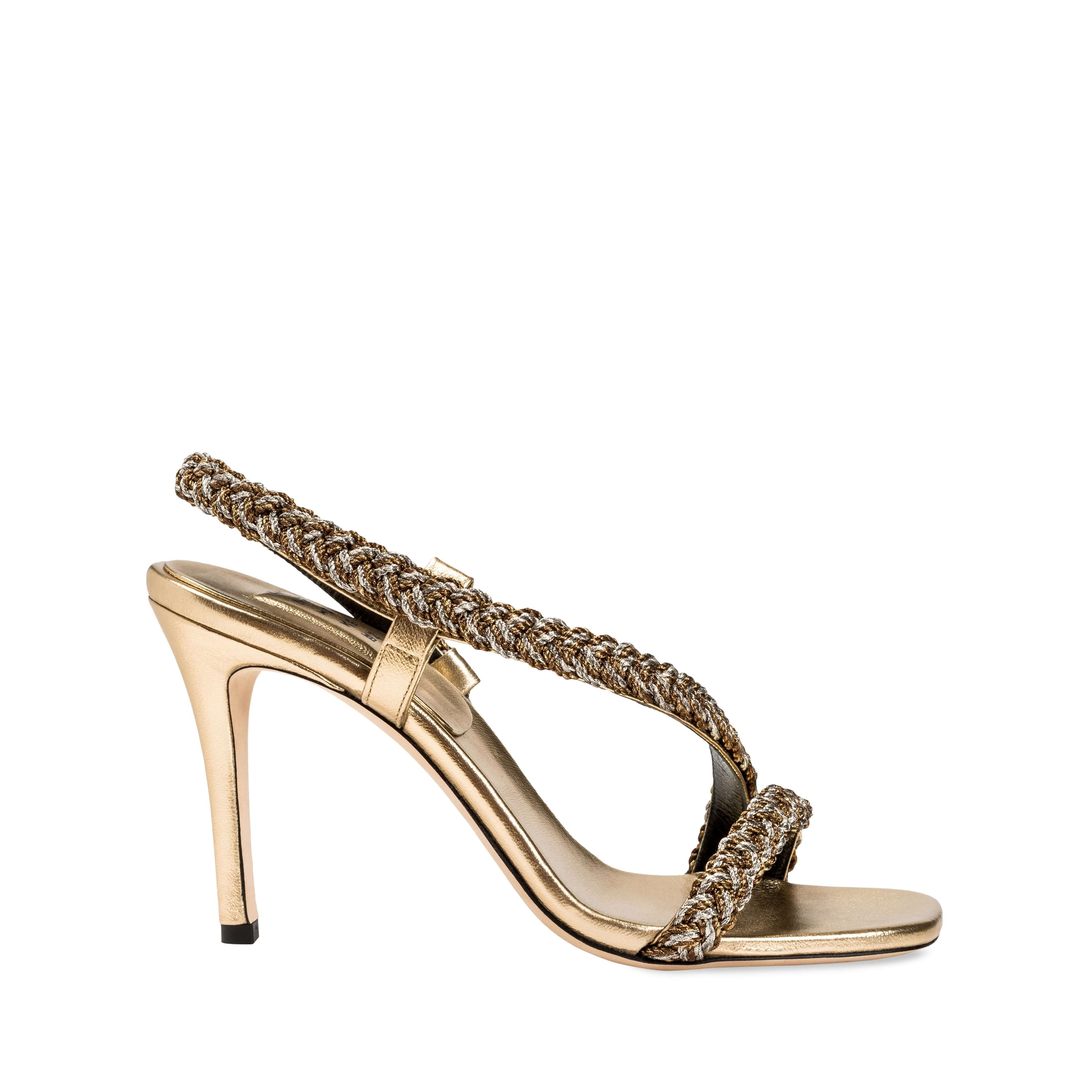 The Ronda High Heel Sandal features antique gold braiding thread embroidery that caresses the foot. The ninety millimeters thin heel adds delicacy while the golden Italian leather provides elegance. This shoe will add a touch of delicate refinement to any ensemble.